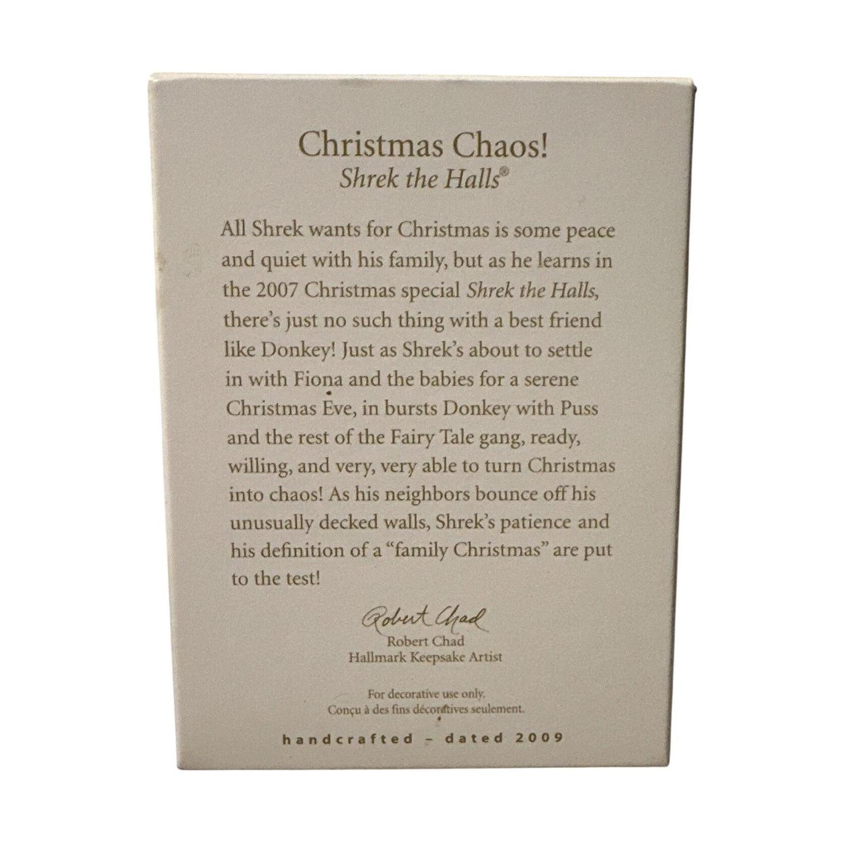 Embrace the wild family Christmas with 2009 Christmas Chaos (Shrek the Halls). This Hallmark Keepsake ornament features Shrek and Donkey in mid-decorating disaster: Donkey’s helping with tinsel, ornaments are scattered, and the Fairy Tale gang is about to turn Shrek’s peaceful Christmas into pandemonium. It captures a hilarious still from the Shrek the Halls holiday special. The ornament comes in its original gift box; no batteries, cords, or lighting effects — purely classic keepsake fun.