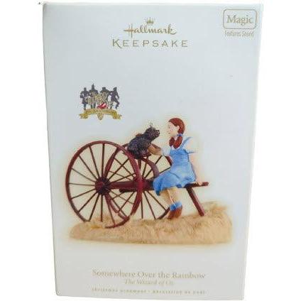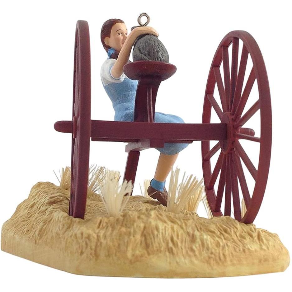 Let the magic of Oz fill your heart with this enchanting 2009 Magic Keepsake ornament, Somewhere Over the Rainbow. Featuring Dorothy and Toto seated on a hay rake in Kansas, this ornament plays the timeless classic “Over the Rainbow” when you press the button at its base. Crafted by Anita Marra Rogers, it measures about 4″ wide and comes with batteries included. Many listings include the original box and tag.