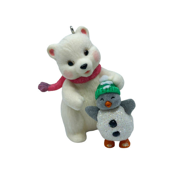 This delightful 2009 Keepsake ornament (SKU QX8022) from Hallmark features the playful duo Snowball the polar bear and Tuxedo the penguin enjoying a snow-day adventure. Snowball is shown wearing a red scarf while Tuxedo dons a green stocking cap, capturing their friendly winter antics in vibrant painted detail. Designed by artist Joanne Eschrich, the piece measures approximately 2.6″ tall and brings cheerful charm to any holiday collection. With its joyful scene and collectible appeal, it’s a fun addition for both animal-theme and Hallmark Keepsake enthusiasts.