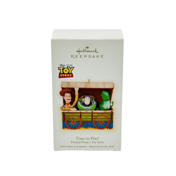 A playful highlight from Hallmark’s Disney line, 2009 Time to Play! (Toy Story) captures the joyful anticipation of playtime. The ornament shows Buzz Lightyear, Woody, and Rex standing inside a toy chest, with Woody holding up the lid in a pose of excitement—“Now the fun can begin!” The exterior of the toy chest is styled like a covered wagon, blending the toy room with a touch of storytelling charm.