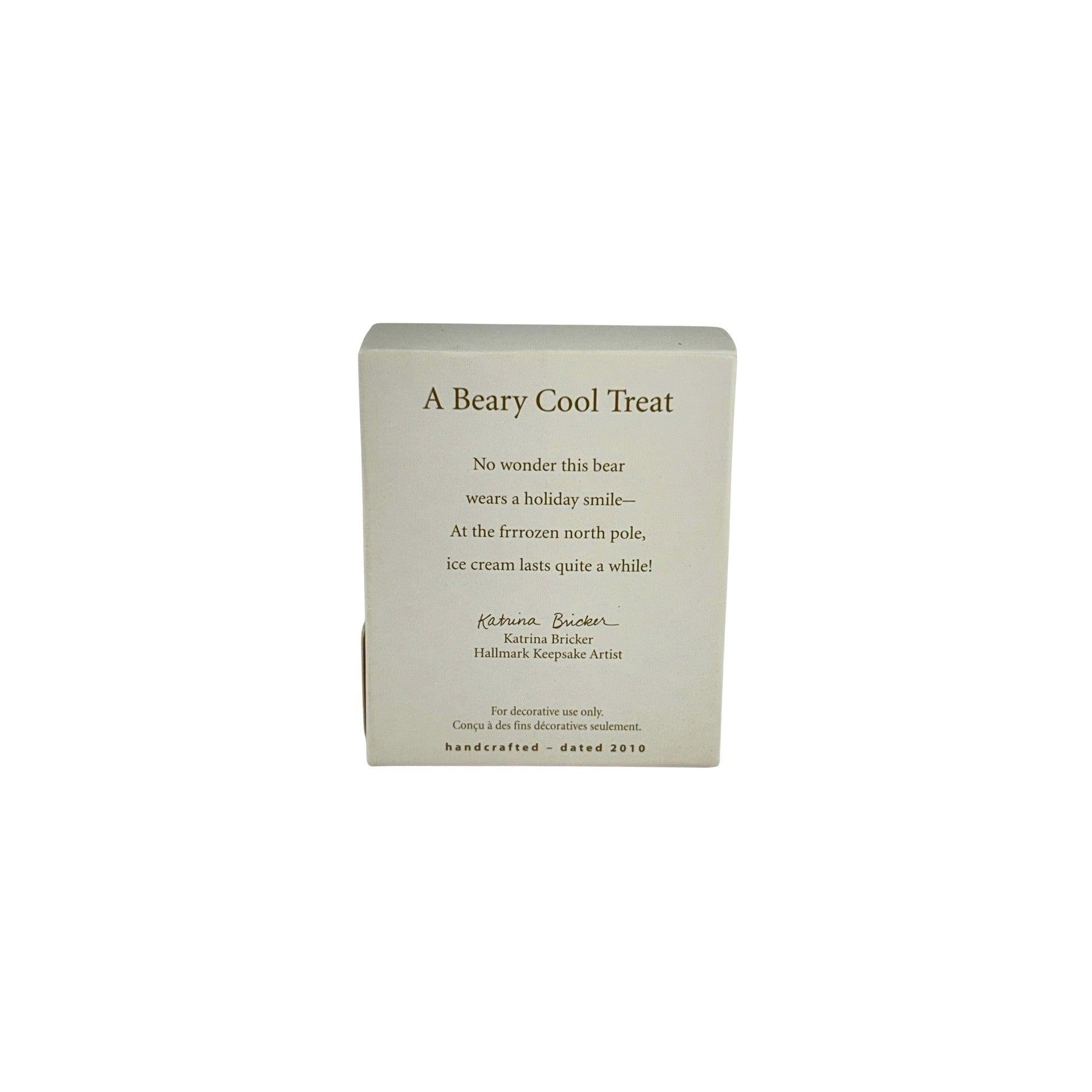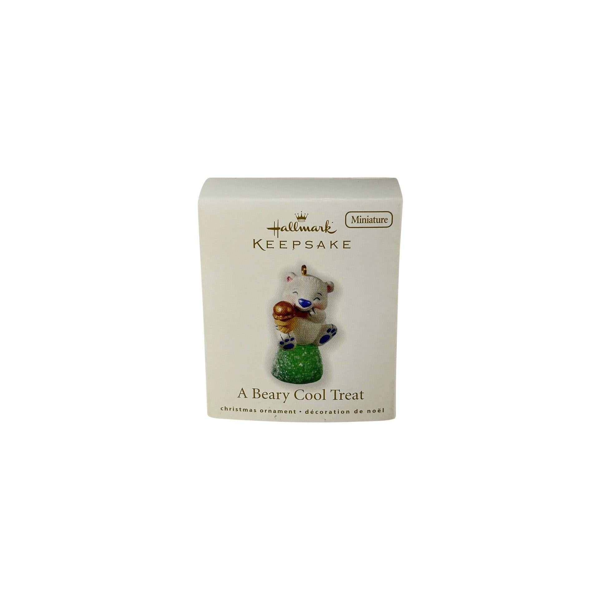 This Hallmark Christmas tree ornament titled “A Beary Cool Treat” features an adorable polar bear enjoying a sweet frozen treat, capturing a playful and lighthearted winter moment. The bear’s cheerful expression and whimsical pose add charm, while the sculpted details and soft colors make it a delightful addition to animal-themed or polar bear ornament collections. The fun design balances winter imagery with a humorous twist, making it especially appealing for collectors who enjoy cute and character-driven ornaments. The ornament comes new in its original Hallmark box, including a molded protective insert and hanging attachment. No batteries, cords, or light strings are required.