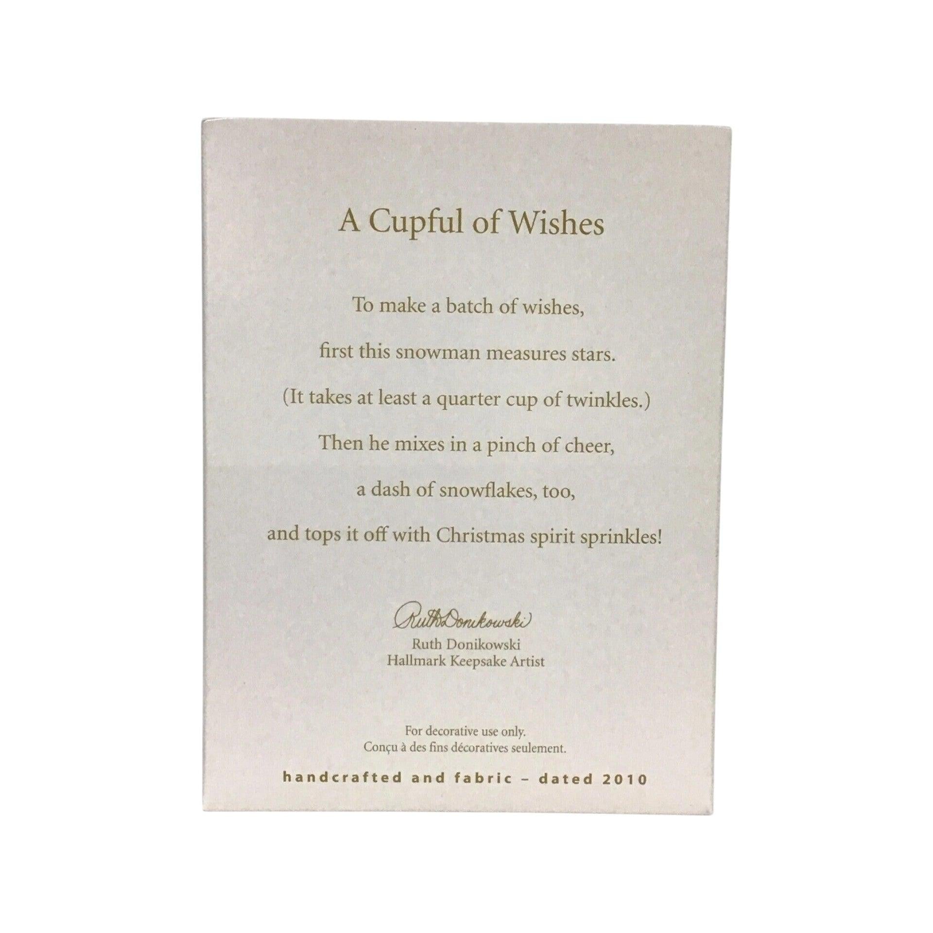 This festive ornament features a cheerful fabric snowman seated in a large tin-style cup, bringing a whimsical “cupful of wishes” theme to holiday décor. Designed by artist Ruth Donikowski, the sculpt combines soft fabric textures and metal/painted cup detail with a 2010 date subtly included in the design. The piece evokes a playful, cozy feel—ideal for collectors who enjoy snowmen, fabric ornaments, or themed kitchen/tree décor. Its size and mixed-material construction make it suitable as both a tree hanging or a small display item.