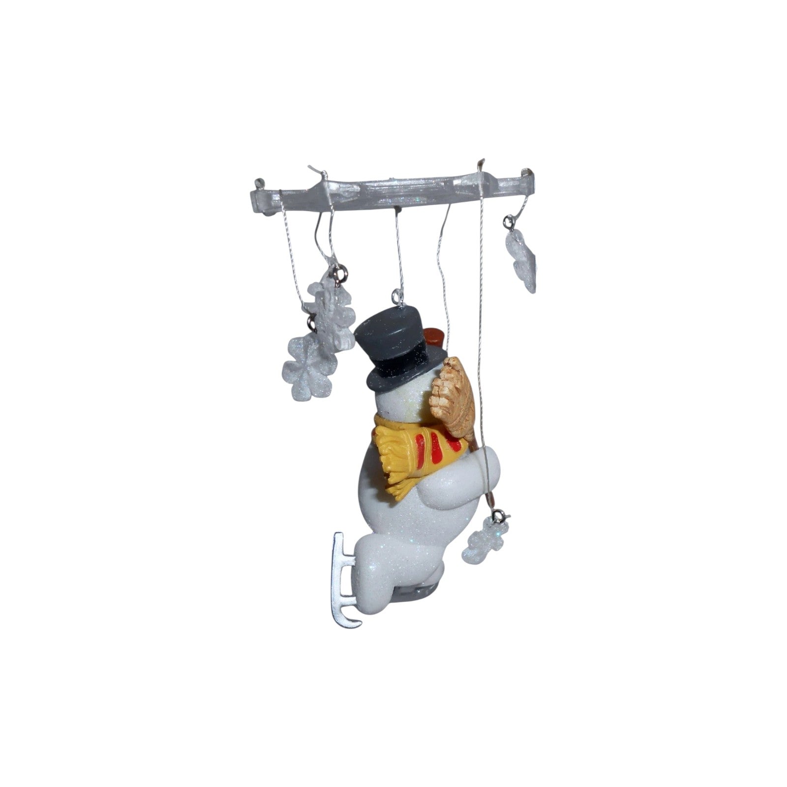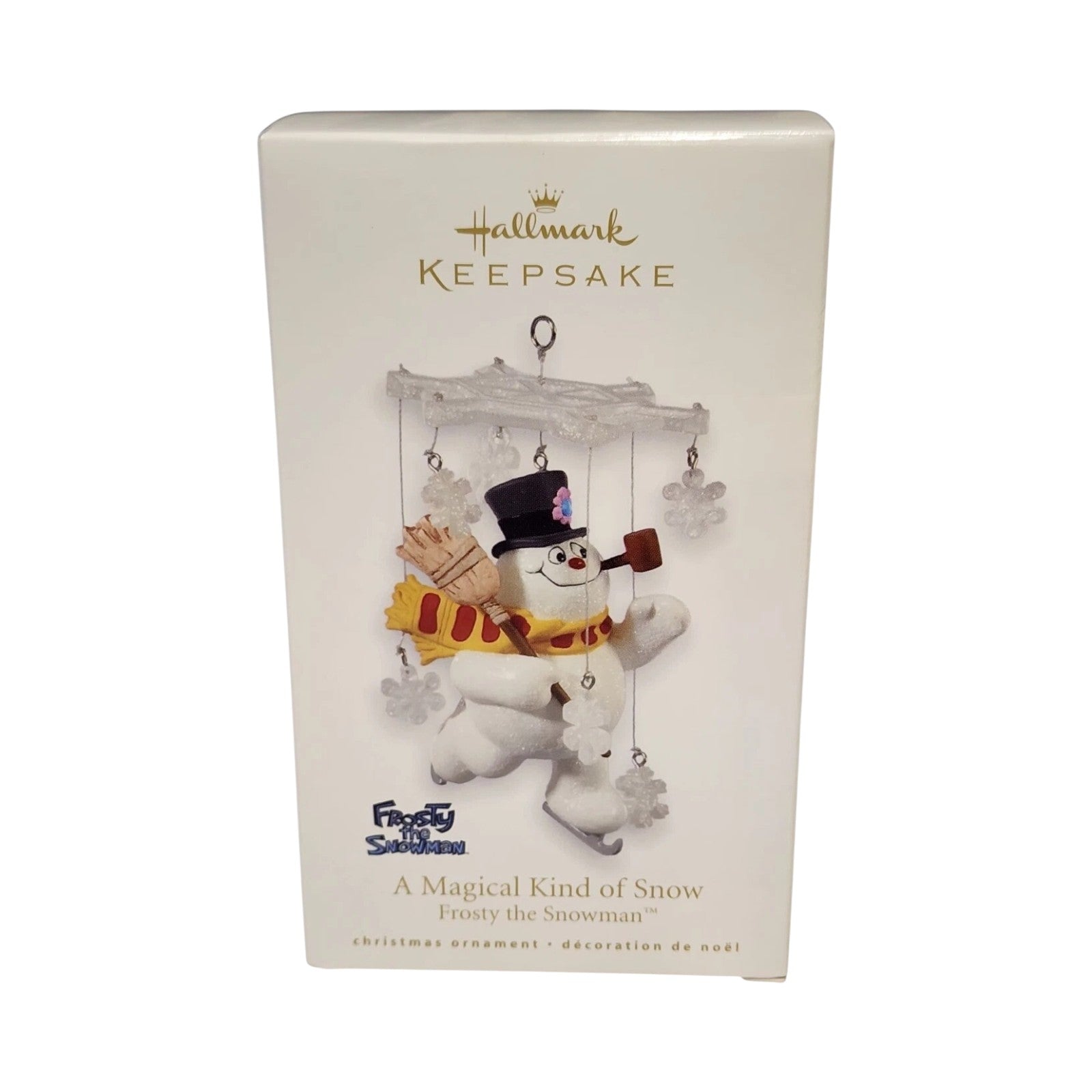 This ornament features Frosty the Snowman suspended from a large snowflake, surrounded by smaller dangling snowflake accents, capturing a whimsical winter scene. Frosty is depicted with his traditional top hat, corncob pipe, scarf, and broom, all sculpted with cheerful charm. It was designed by artist Nello Williams and issued in 2010, making it appealing to collectors who enjoy nostalgic holiday characters and snowman-themed décor. The shimmering snowflake motif gives the decoration a lively motion and seasonal sparkle, making it a delightful addition to a holiday tree or collectible display.
