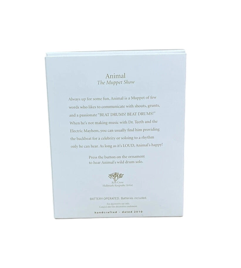 Ever the wild drum-beater, Animal takes center stage in this 2010 Magic ornament. Press the button and you’ll hear his signature drum solo come alive, accompanied by flashing lights. The ornament captures Animal mid-performance, seated at his drum kit, in full color and detail. It comes in the original Keepsake box and includes the hang tag. It is battery powered and no cords or external light strings are required.