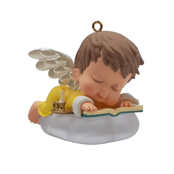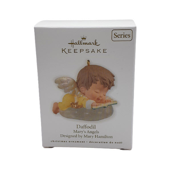Sweet Daffodil joins Hallmark’s beloved Mary’s Angels as the 23rd angel in the series, released in 2010. This peaceful miniature depicts a brown-haired angel reclining on a fluffy cloud beside a softly glowing candle, lost in a bedtime story. The mint-in-box set typically includes the ornament, hanging loop, original collector’s box (often undated), and tag. It is purely decorative—no power, batteries, or lighting needed .