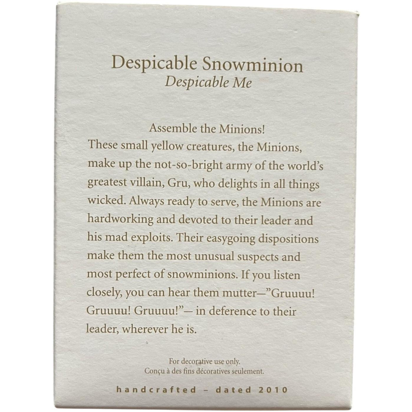 Bring a touch of animated mischief to your holiday décor with Despicable Snowminion, a 2010 Hallmark Keepsake Ornament from the Despicable Me line. This ornament features a lovable Minion sculpted in snowy winter garb, “carving” a snow-Minion in joyful, frosty fun. The design shows him bundled up in winter gear with snow texture, a carrot nose, and that classic one-eye expression.