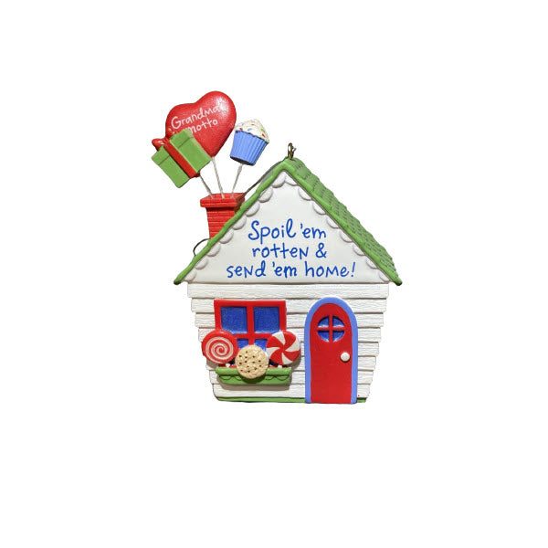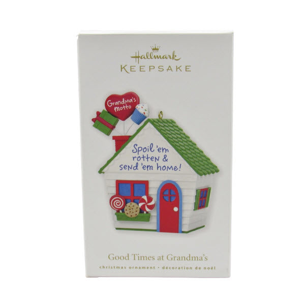 The 2010 Hallmark Keepsake ornament “Good Times at Grandma’s” (SKU QXG7463) celebrates the warmth and humor of family visits. Designed by Ruth Donikowski, it features a cozy red house with festive green trim and the fun inscription, “Spoil ’em rotten & send ’em home!” This piece captures the loving spirit of grandmothers everywhere—those who fill the holidays with joy, laughter, and maybe a little extra dessert. Crafted in painted resin and standing about 3½″ tall, it’s perfect for family-themed trees or as a sentimental gift for Grandma.