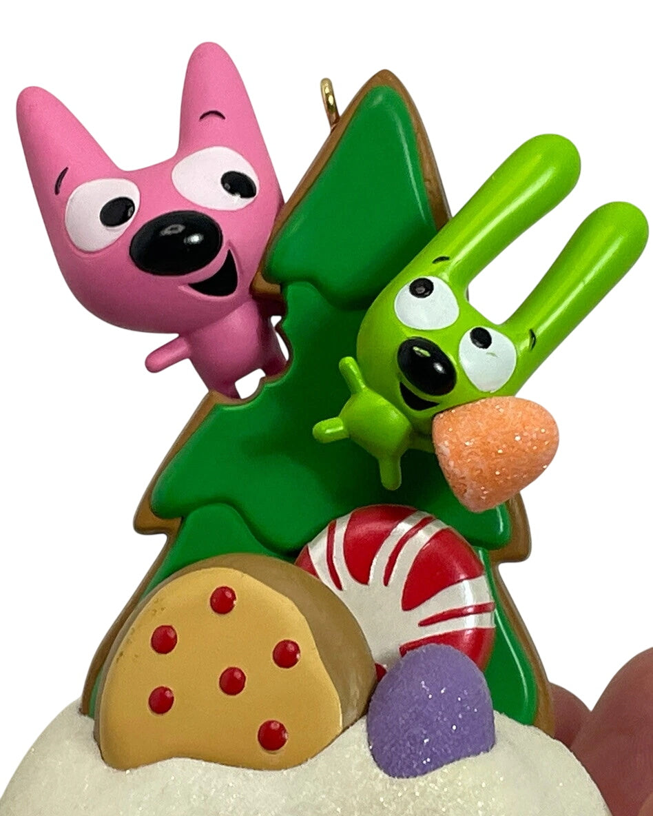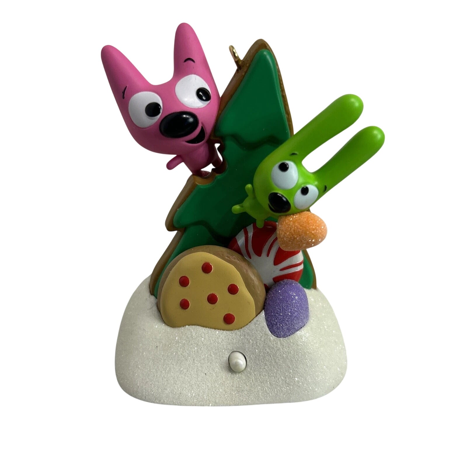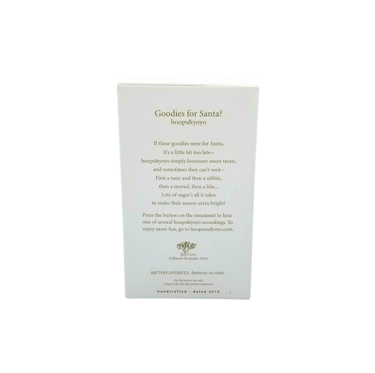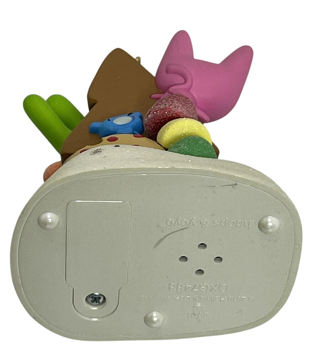 This playful “Magic” keepsake ornament from Hallmark features the mischievous characters Hoops & Yoyo guarding a mountain of Christmas goodies while sarcastically asking if they’re really meant for Santa. Press the front-button and hear one of several witty dialogue recordings as the duo tease Santa, making this piece a fun, interactive addition to any holiday tree. Standing approximately 3½″ high and crafted in multicolored resin and plastic, it appeals both to collectors of novelty sound-ornaments and fans of the Hoops & Yoyo characters.