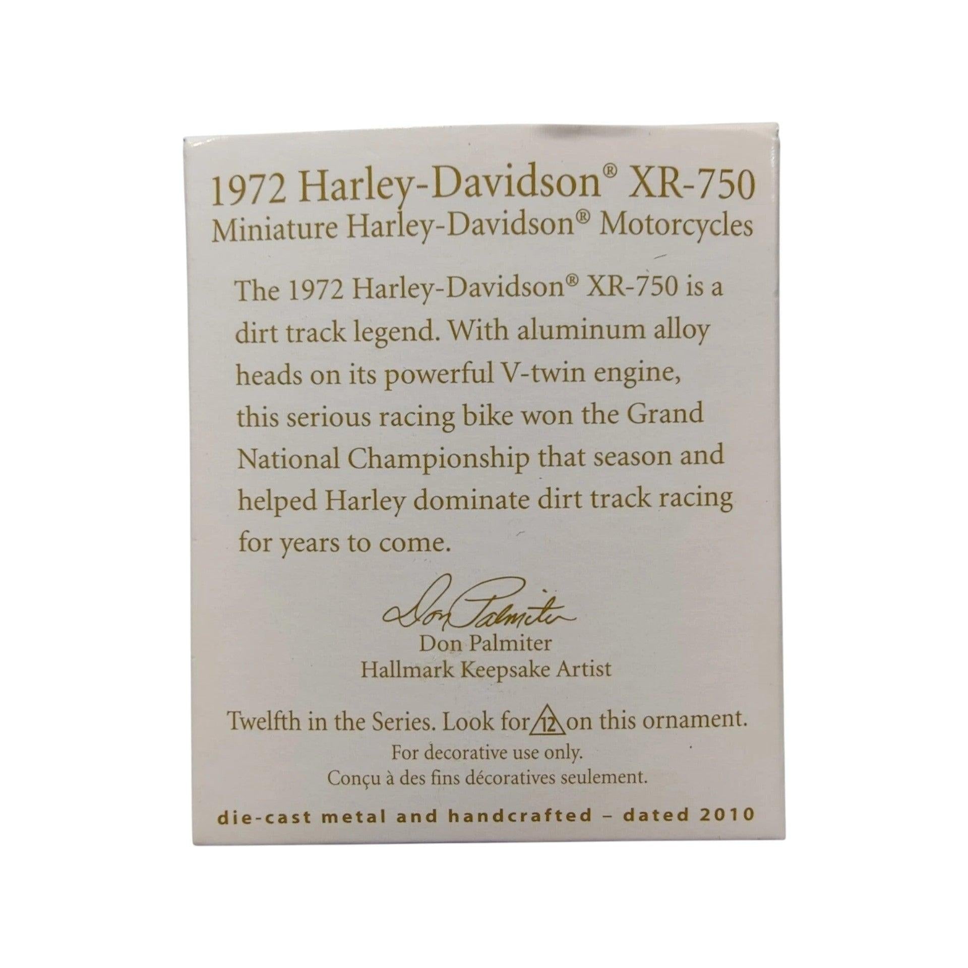 Rev your collection with the 2010 Hallmark Keepsake miniature, 1972 XR‑750. As the 12th release in the Mini Harley‑Davidson Motorcycles series, this replica pays tribute to the iconic XR‑750—an AMA dirt‑track dominator and Evel Knievel’s bike of choice. Crafted from die‑cast metal by Don Palmiter, it's packed with authenticity—from its racing fairing to its commanding stance—and features turning wheels for motion realism. A must-have for motorcycle aficionados and collectors seeking a small-scale powerhouse that requires no batteries or lights.