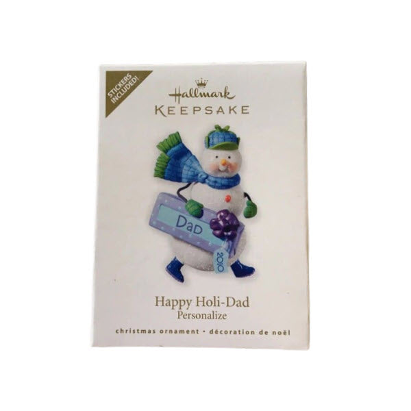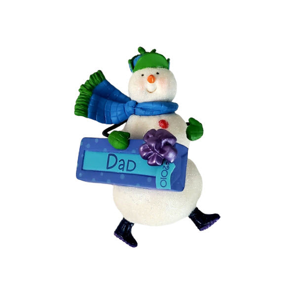 Celebrate fatherhood this holiday season with the 2010 Keepsake ornament (SKU QXG7013) from Hallmark. This cheerful design features a snowman dressed in a blue hat and scarf carrying a gift box labeled “Dad 2010”. The listing notes that personalization stickers are included, allowing you to add Dad’s name or a short message, making it perfect as a customized gift for a father. Designed by artist Nina Aubé, this ornament measures approximately 3″ tall and blends holiday spirit with a personal touch — ideal for the family-themed tree or as a memorable keepsake for Dad.