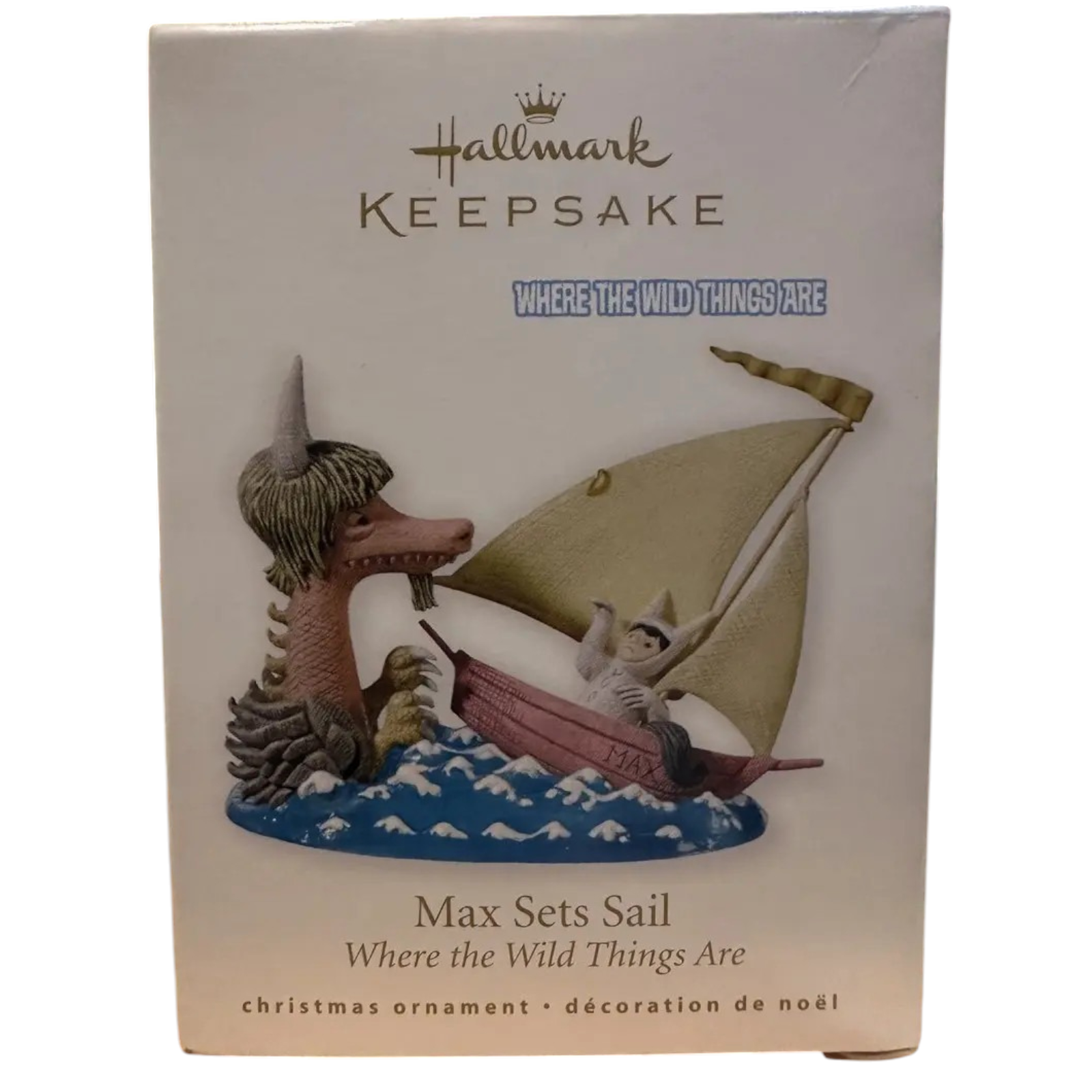 This 2010 Keepsake ornament from Hallmark features Max, the adventurous boy in his wolf suit, setting sail in his iconic little boat accompanied by one of the Wild Things. Sculpted by artist Sharon Visker, the design uses finely modelled resin with vivid colour detail and captures the imaginative spirit of the classic children’s story. Ideal for fans of the book, film adaptations, or collectors of character-themed Hallmark ornaments, this piece nicely blends literary nostalgia with holiday décor.