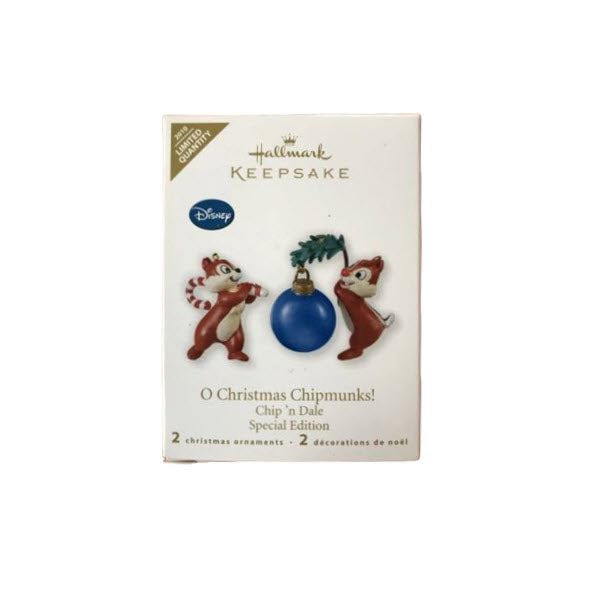 This festive limited-quantity ornament from Hallmark features the beloved chipmunk duo Chip 'n Dale in a holiday setting, capturing their playful antics amid the sparkle of Christmas. Designed by sculptor Tammy Haddix, it uses bright colors and cheerful detailing to evoke the fun of the classic Disney story of the chipmunks getting into mischief in the tree. As a 2010 “O Christmas Chipmunks!” model, it appeals to both Disney fans and ornament collectors alike thanks to its character tie-in and premium edition status. Compact in size, this piece makes a charming addition to themed trees, Disney-character collections, or holiday displays.