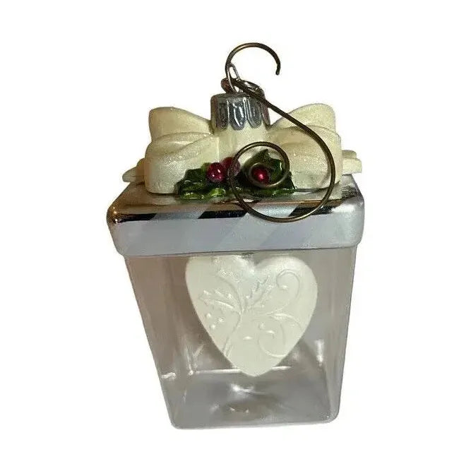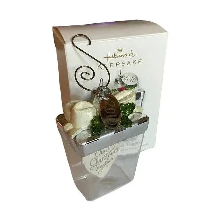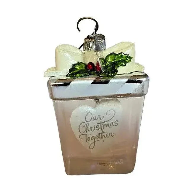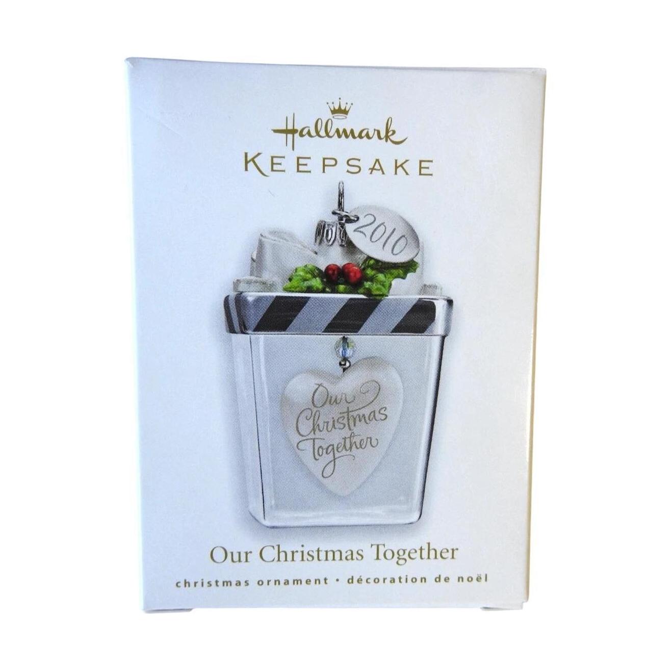 This keepsake ornament from Hallmark features a delicately crafted clear glass box that contains a white heart inscribed with the words “Our Christmas Together.” A small dated metal tag reading “2010” dangles from the top inside the box, symbolizing a shared holiday memory. The minimalist, elegant design makes it especially suited for commemorating a relationship or significant year spent together. Crafted in glass and described as handcrafted, it blends simplicity with meaningful sentiment aimed at couples or families.
