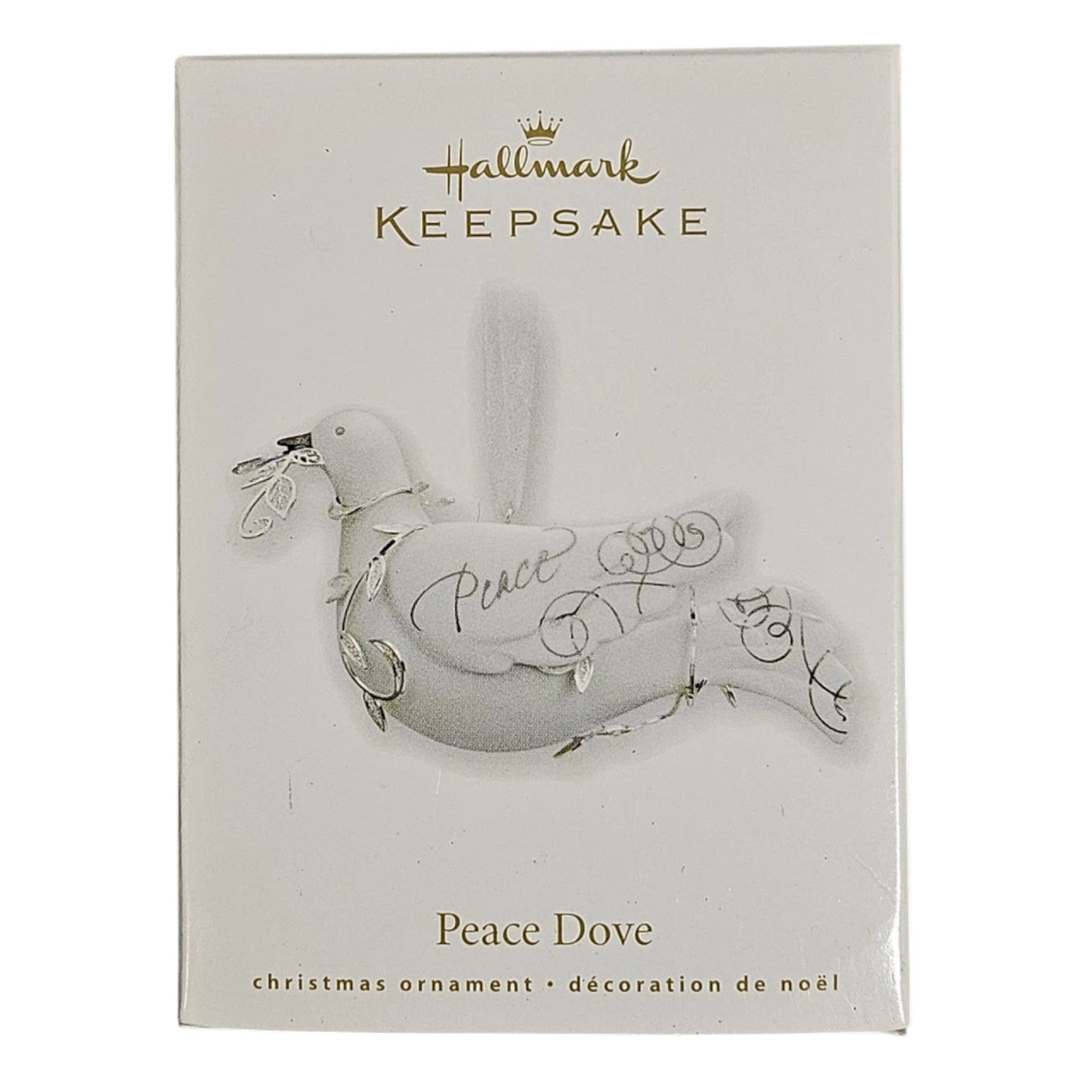 Embrace the spirit of tranquility with the 2010 Peace Dove ornament, a serene addition to Hallmark's Simply Beautiful collection. This handcrafted porcelain dove gracefully carries an olive branch, symbolizing peace. Adorned with delicate silver accents, the dove is inscribed with the word "Peace," adding a heartfelt touch to your holiday decor.