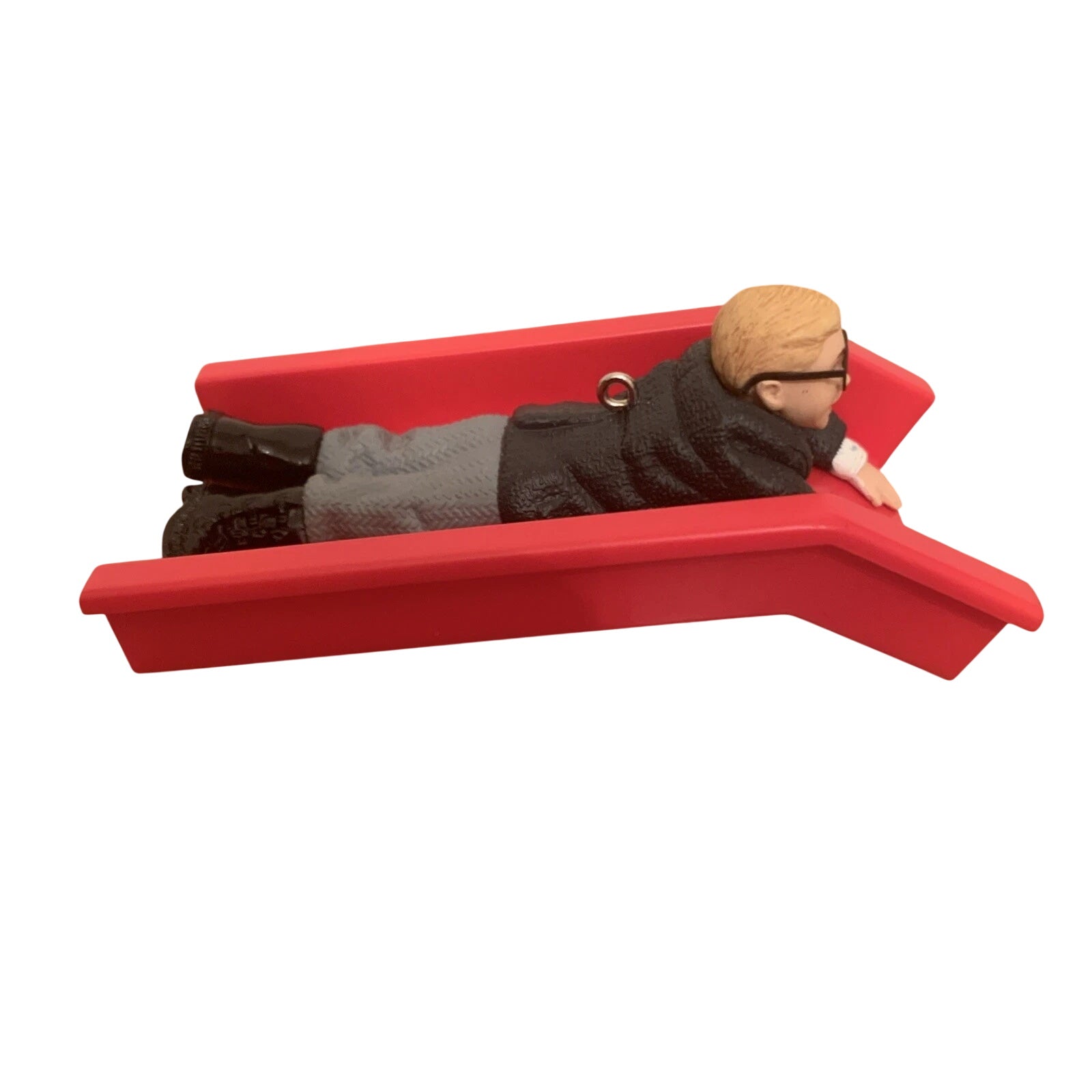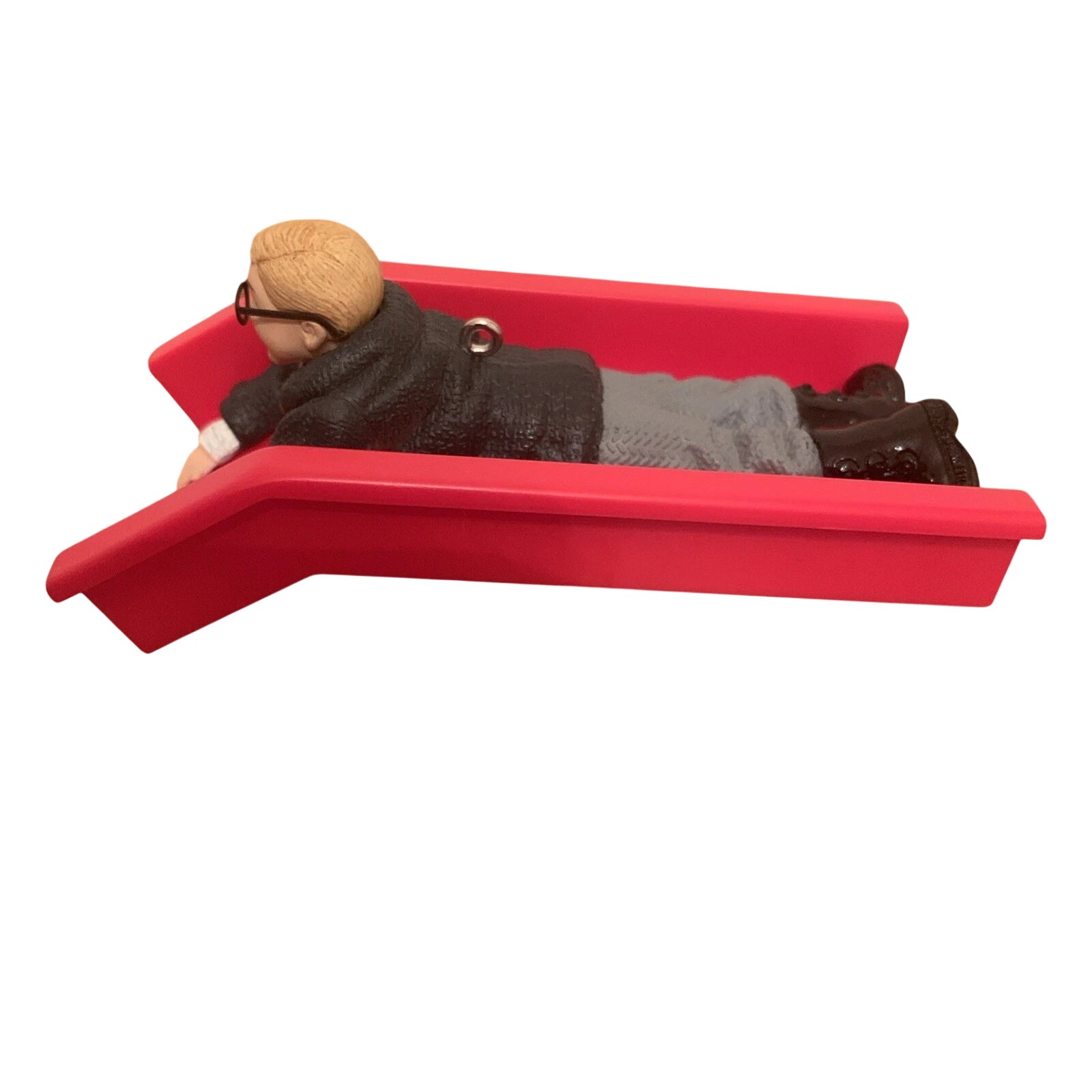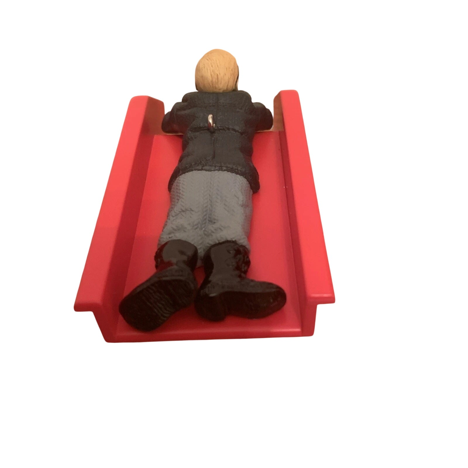 Revisit Ralphie's iconic climactic moment as he scrambles to the top of the slide to whisper his wish for a Red Ryder BB gun—only to hear Santa’s classic reply: “You’ll shoot your eye out, kid!” This 2010 Hallmark Keepsake ornament captures him mid-slide, just before being pushed down by a mischievous elf. Arrives mint-in-box with memory tag and hanger, and requires no batteries or cords—just unwrap and hang.
