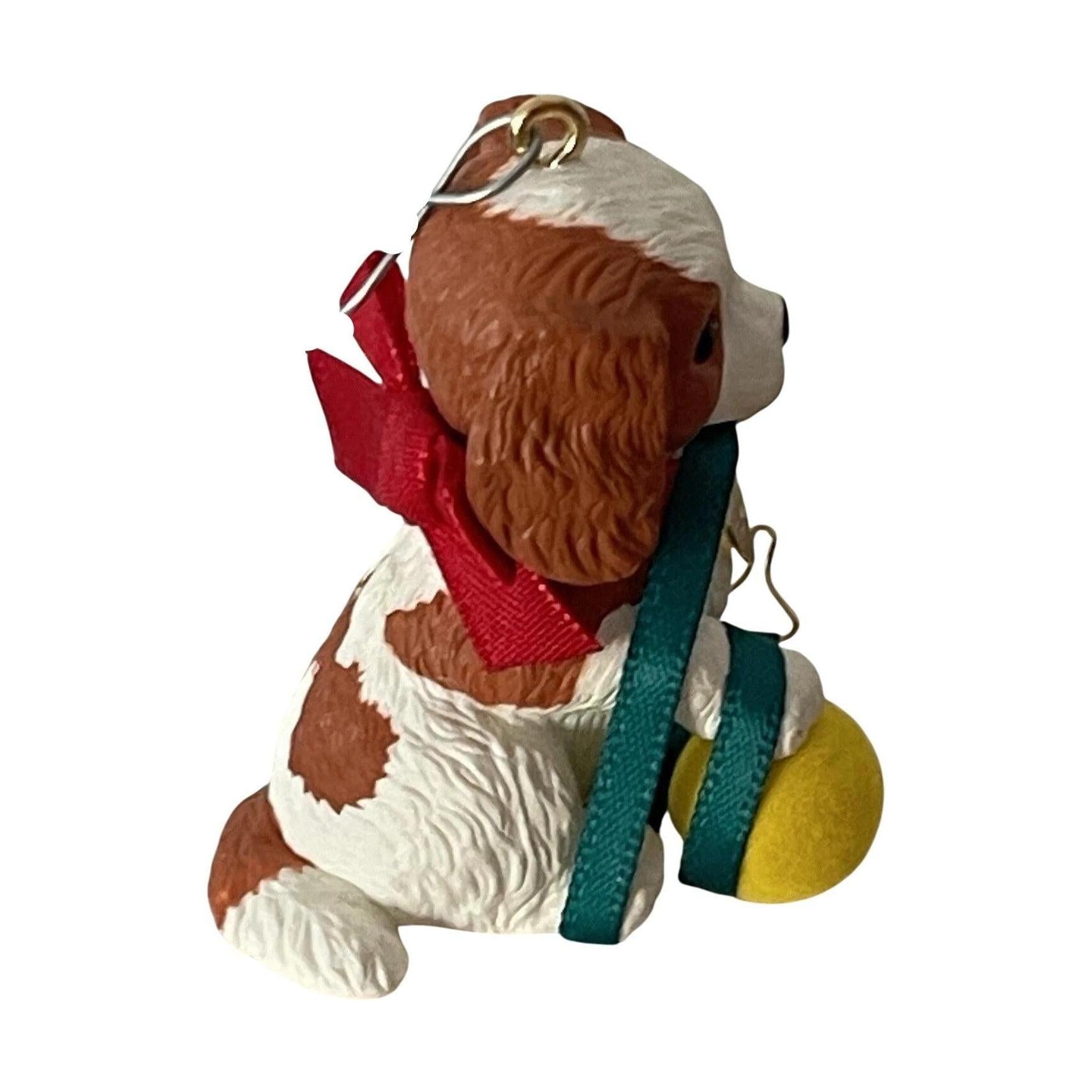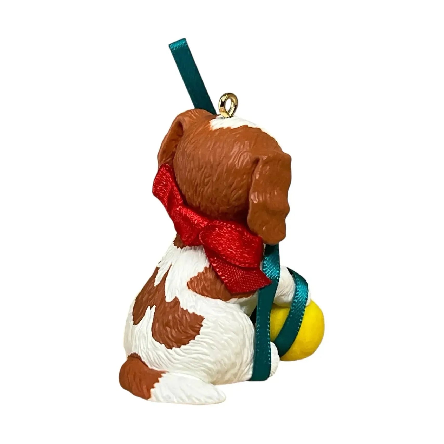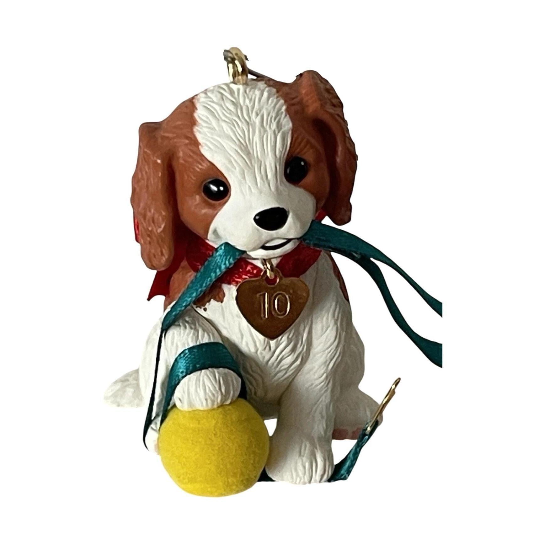 This 2010 (dated) edition of the beloved Hallmark Keepsake ornament series “Puppy Love” (SKU QX8126) celebrates its 20th-in-series milestone with a charming depiction of a Cavalier King Charles Spaniel puppy poised eagerly next to a bright yellow tennis ball. The sculpt, by artist Anita Marra Rogers, is beautifully detailed in painted resin, standing approximately 2″ H and marked with “#20” to denote the series number. This piece is ideal for dog-lover collectors, series completers, or anyone who treasures the “Puppy Love” line of holiday ornaments.