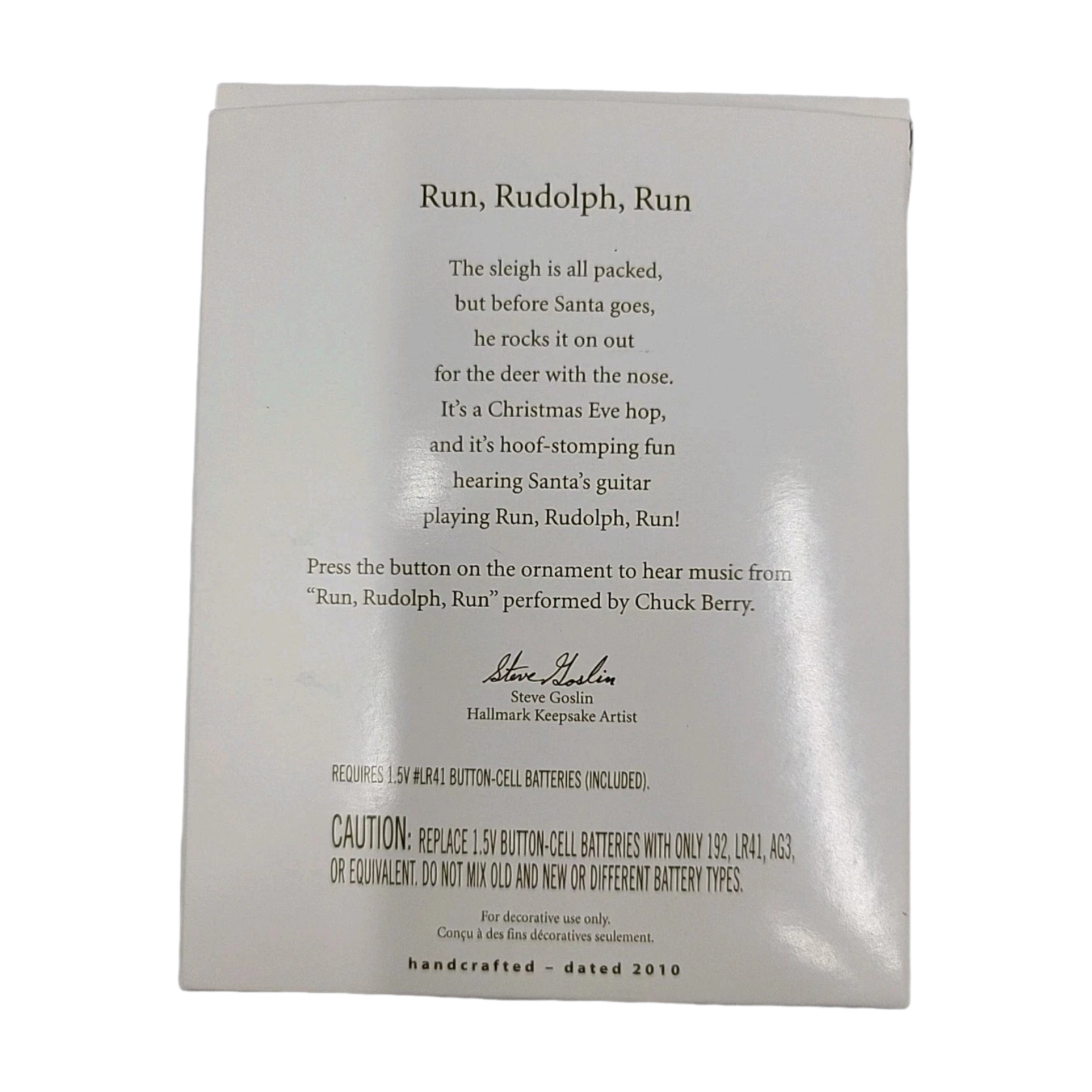 Get ready to rock around the tree with this lively 2010 Hallmark Keepsake “Magic” ornament featuring an electric guitar design that plays the classic holiday hit “Run Rudolph Run” by Chuck Berry. Designed by artist Steve Goslin, this ornament captures the fun, upbeat spirit of the song with bold detailing and vibrant color. Compact and battery-operated, it’s perfect for music lovers, collectors, and anyone looking to add a touch of rock ’n’ roll flair to their holiday décor.