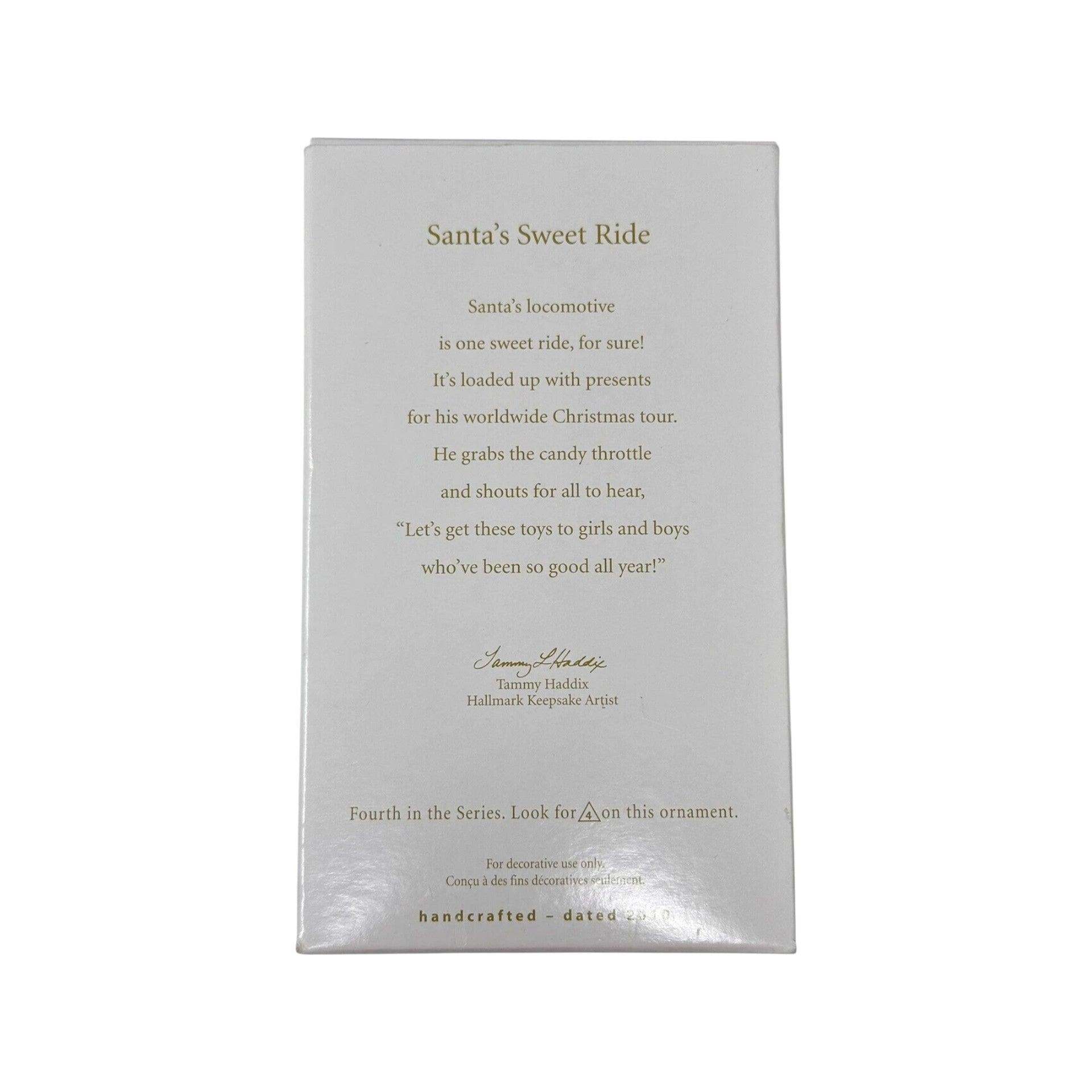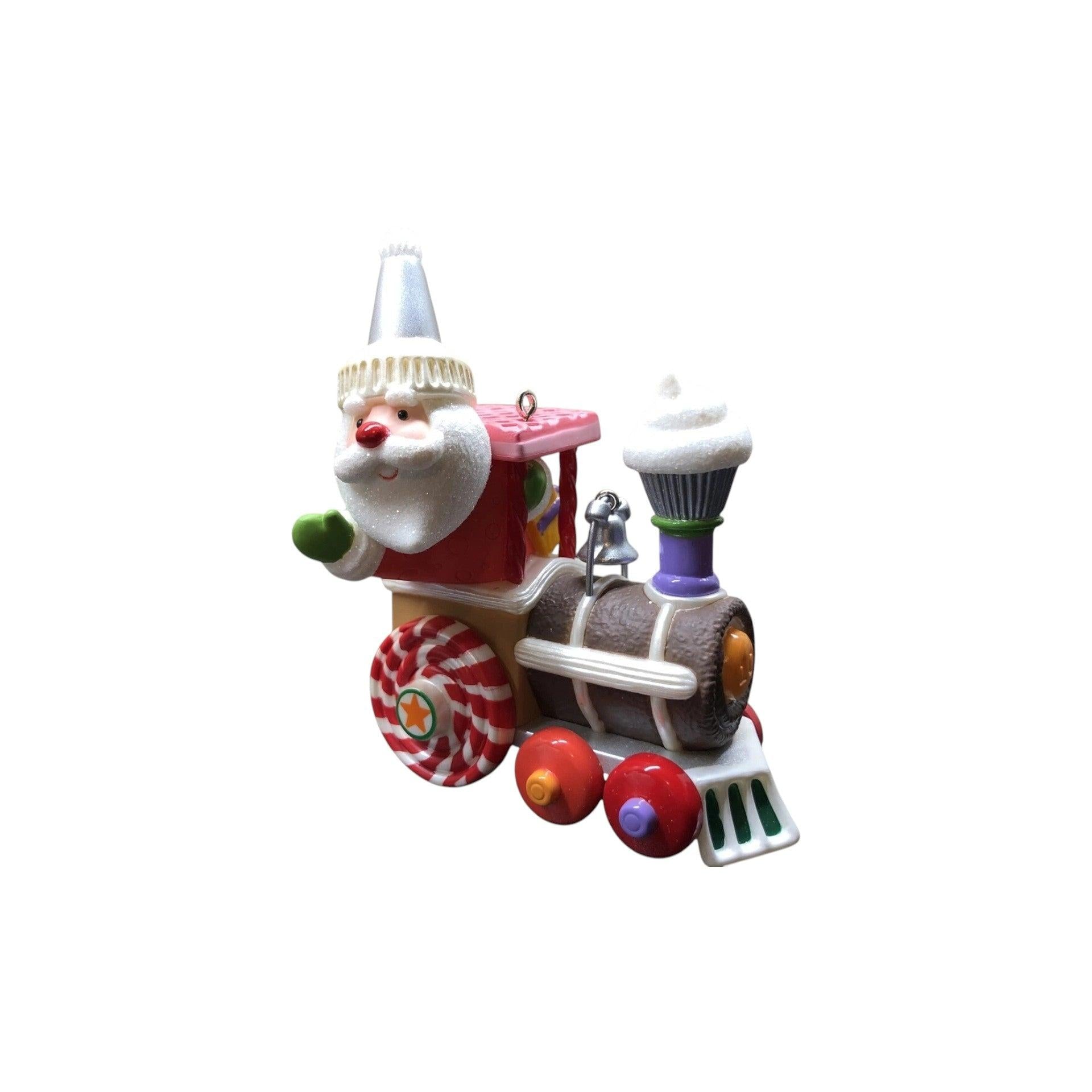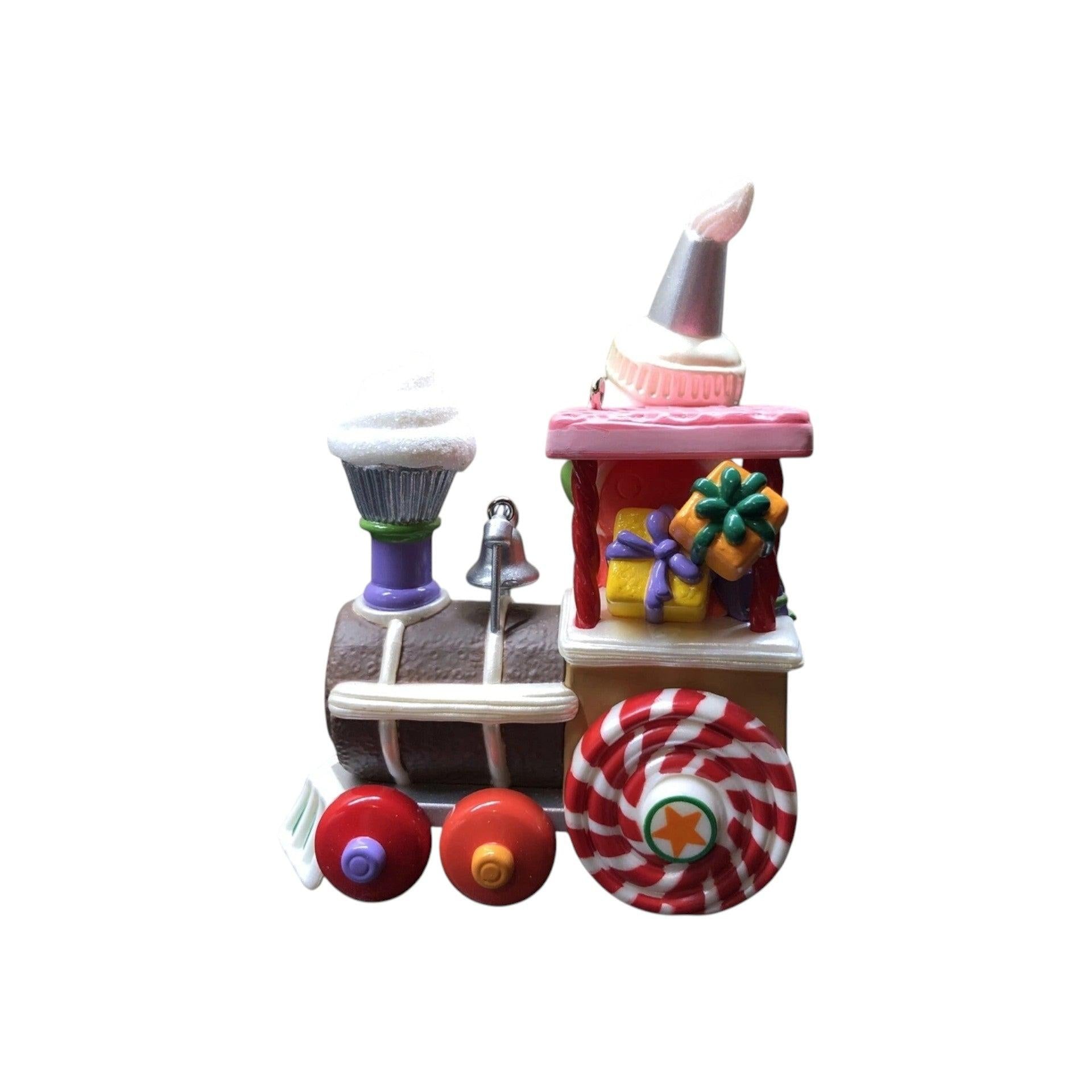This ornament from Hallmark features a whimsical gingerbread-train locomotive piloted by Santa as part of the “Santa’s Sweet Ride” series. The smoke stack resembles a cupcake, the wheels and other train details are candy-themed, and the overall piece blends festive holiday imagery with sweet-treat styling. The 2010 edition is the 4th piece in this series, making it a thematic collectible for both Hallmark ornament enthusiasts and fans of holiday trains or confectionary motifs.
