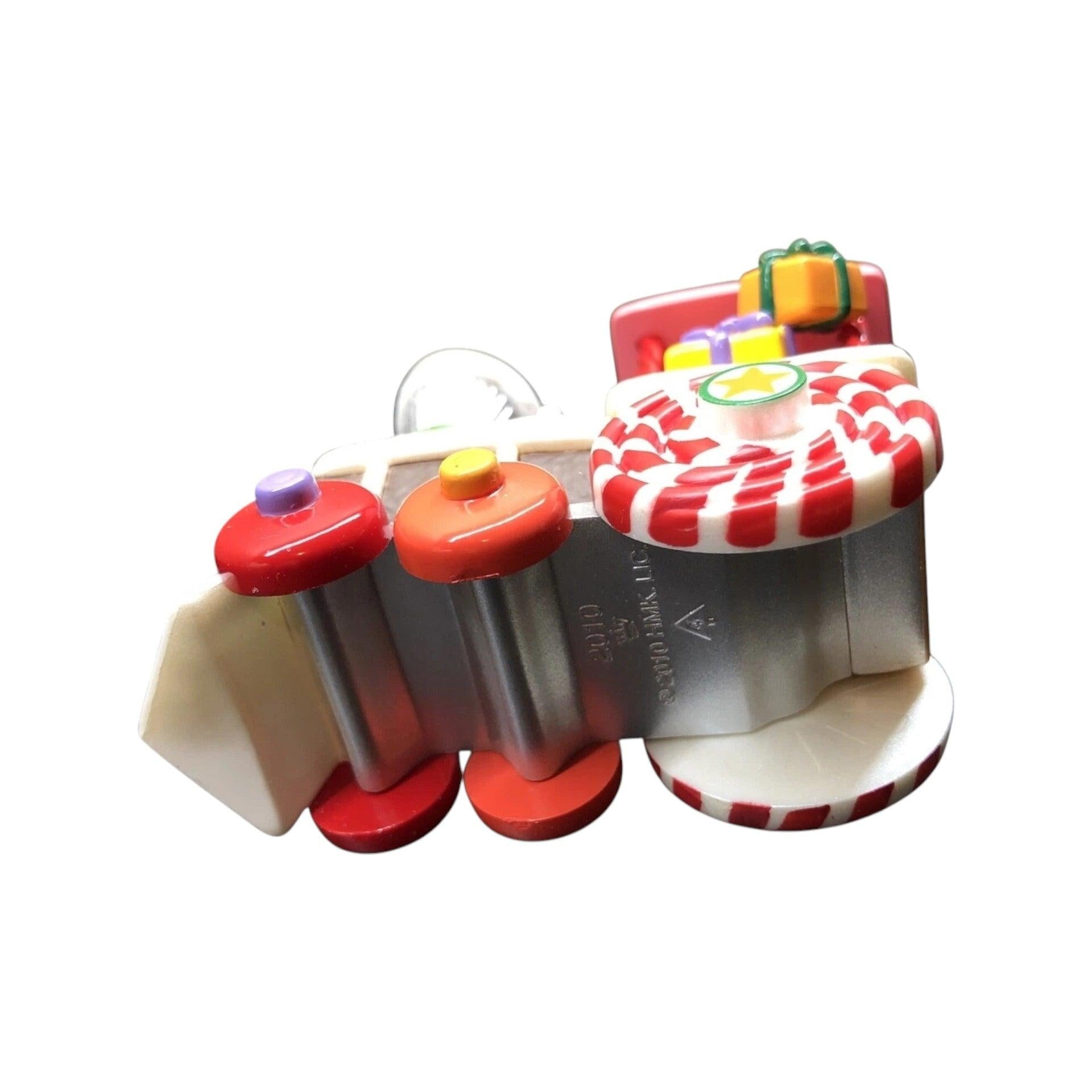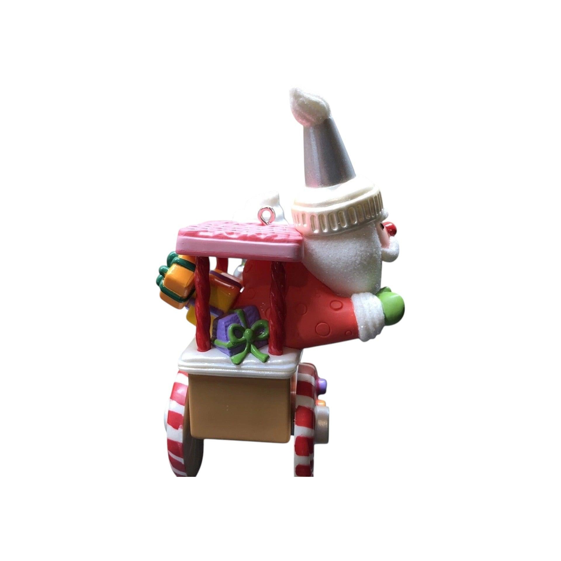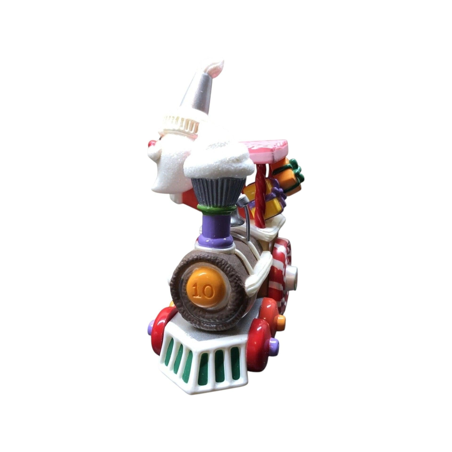 This ornament from Hallmark features a whimsical gingerbread-train locomotive piloted by Santa as part of the “Santa’s Sweet Ride” series. The smoke stack resembles a cupcake, the wheels and other train details are candy-themed, and the overall piece blends festive holiday imagery with sweet-treat styling. The 2010 edition is the 4th piece in this series, making it a thematic collectible for both Hallmark ornament enthusiasts and fans of holiday trains or confectionary motifs.