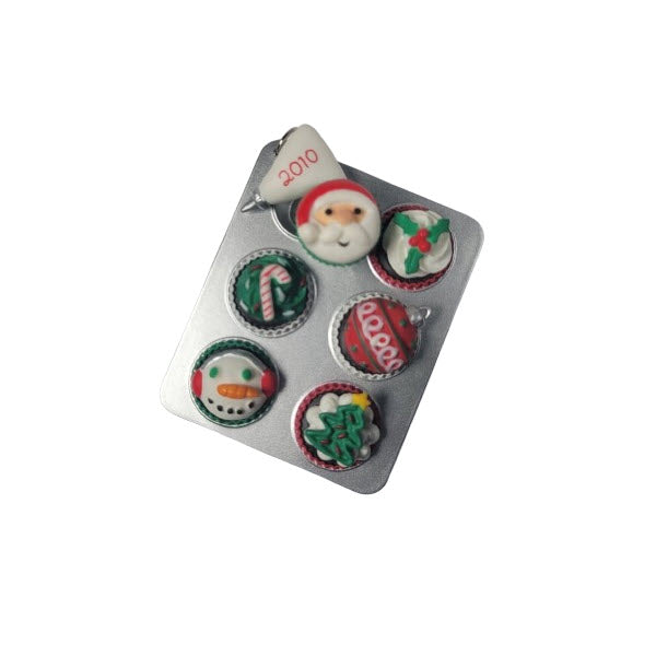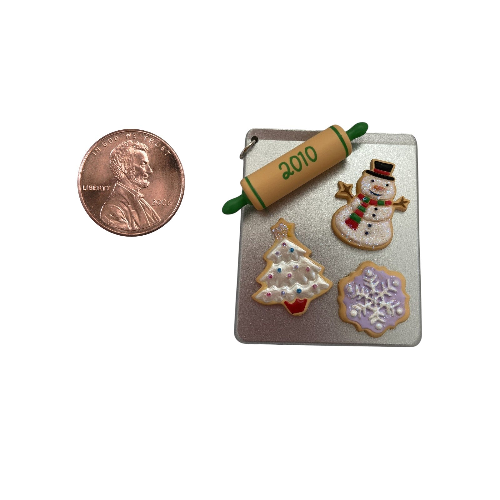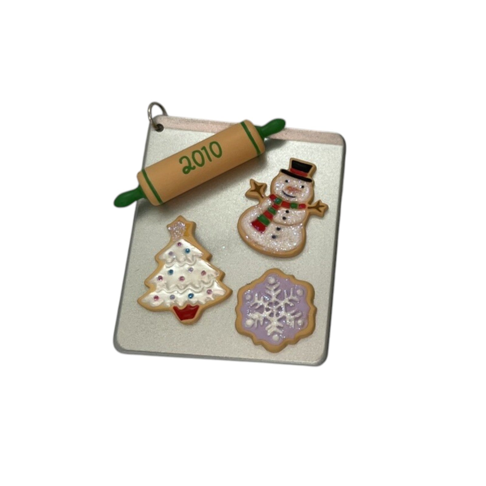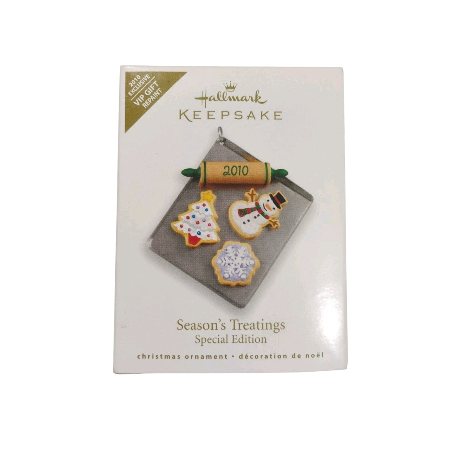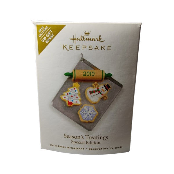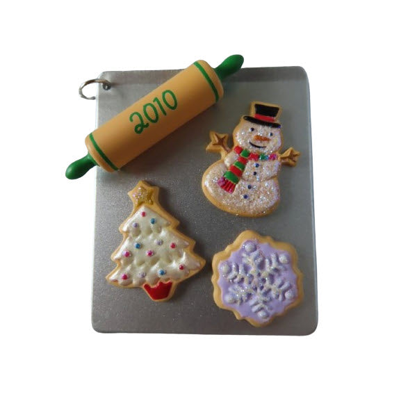 This festive ornament captures a tray of holiday cookies, including a snowman, snowflake, and Christmas-tree shaped sugar cookies, with a rolling pin stamped “2010.” Created as a VIP gift colorway repaint of the original 2009 Season’s Treatings ornament, it is presented in its original collector’s box—dated 2010—and typically includes the hang tag. There’s no motion, sound, or lighting activation—no power needed.