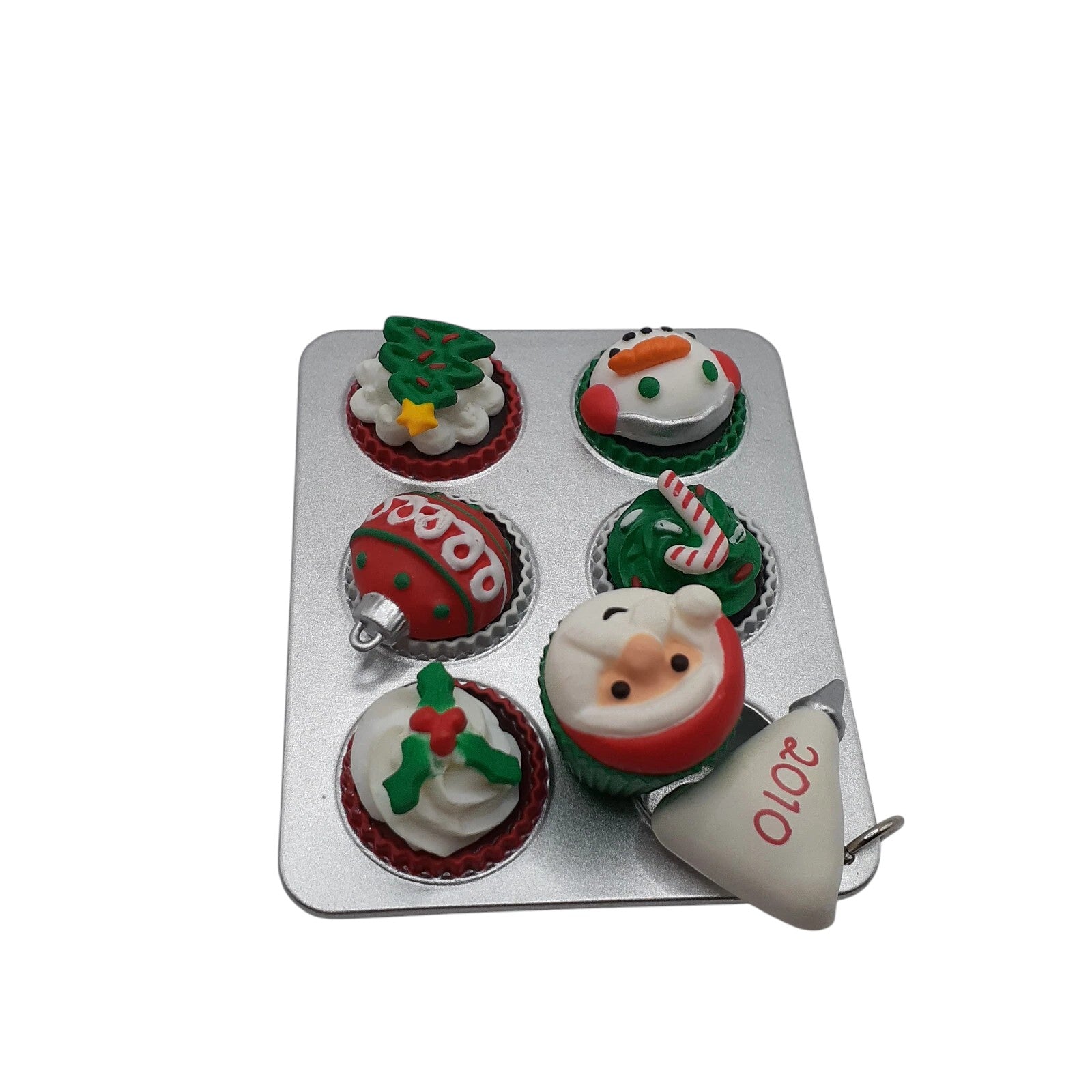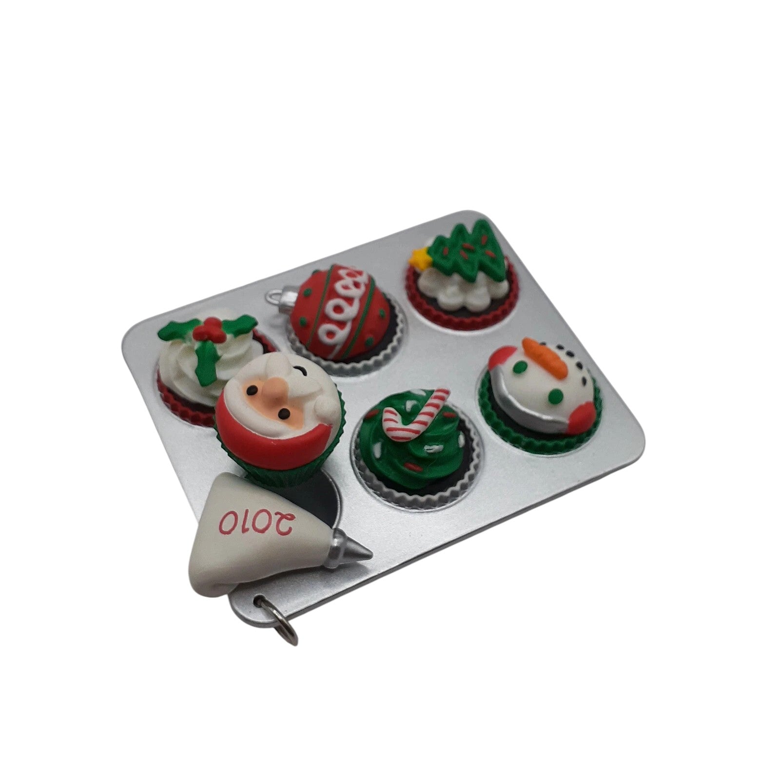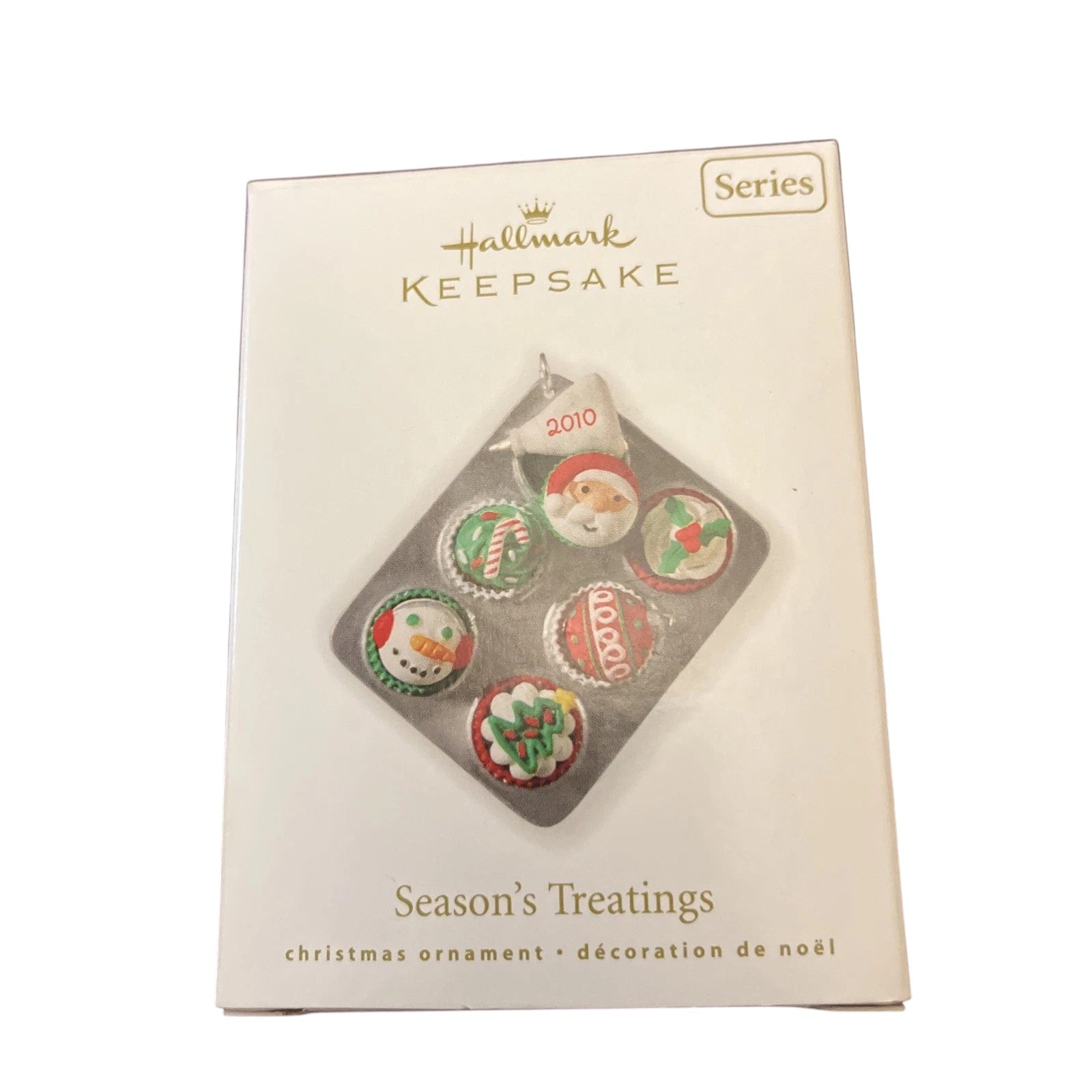 Delight in the festive charm of the 2010 Season's Treatings ornament, a delectable addition to Hallmark's beloved series. This handcrafted ornament features a tin tray filled with six intricately decorated Christmas cupcakes, each topped with festive designs like a snowman, Santa Claus, a candy cane, a Christmas tree, a red ornament, and holly. The icing bag is inscribed with "2010," adding a personalized touch to this sweet keepsake. Designed by artist Sharon Visker, this ornament measures approximately 2¾ inches in width and comes in its original box, making it a perfect collectible or gift.