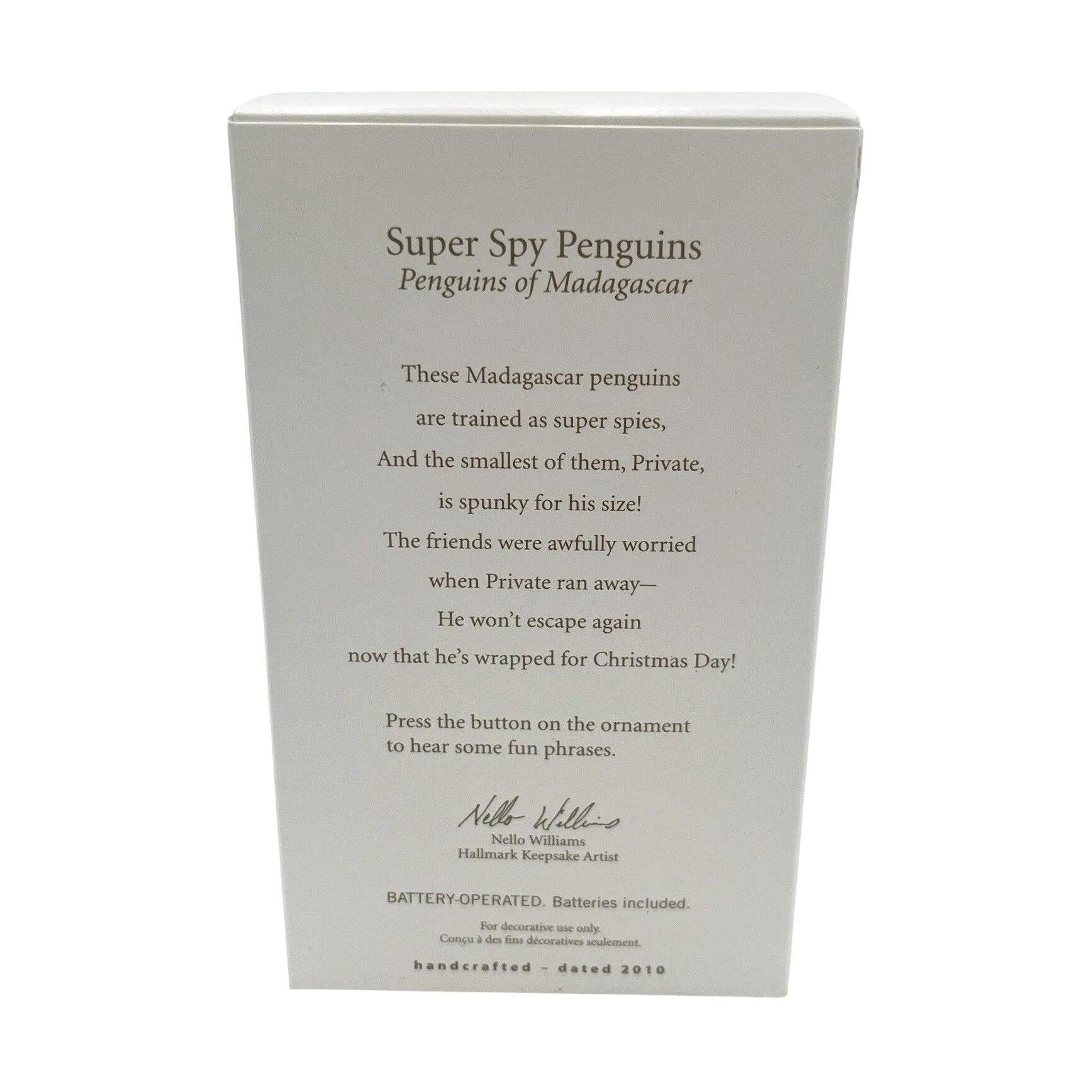 This vibrant keepsake ornament from Hallmark features the four mischievous spy penguins—Skipper, Kowalski, Rico and Private—from Madagascar 2 (and the broader Penguins of Madagascar lineup). It’s a “Magic” model: press the button and you’ll hear fun phrases voiced by the penguins themselves, making it a lively piece of decoration. The design is rendered in multicolored resin/plastic and stands approximately 3″ tall, ideal for both a holiday tree and a collector’s shelf display. As a licensed DreamWorks character ornament issued in 2010, it bridges the world of popular animation with holiday collectibility.