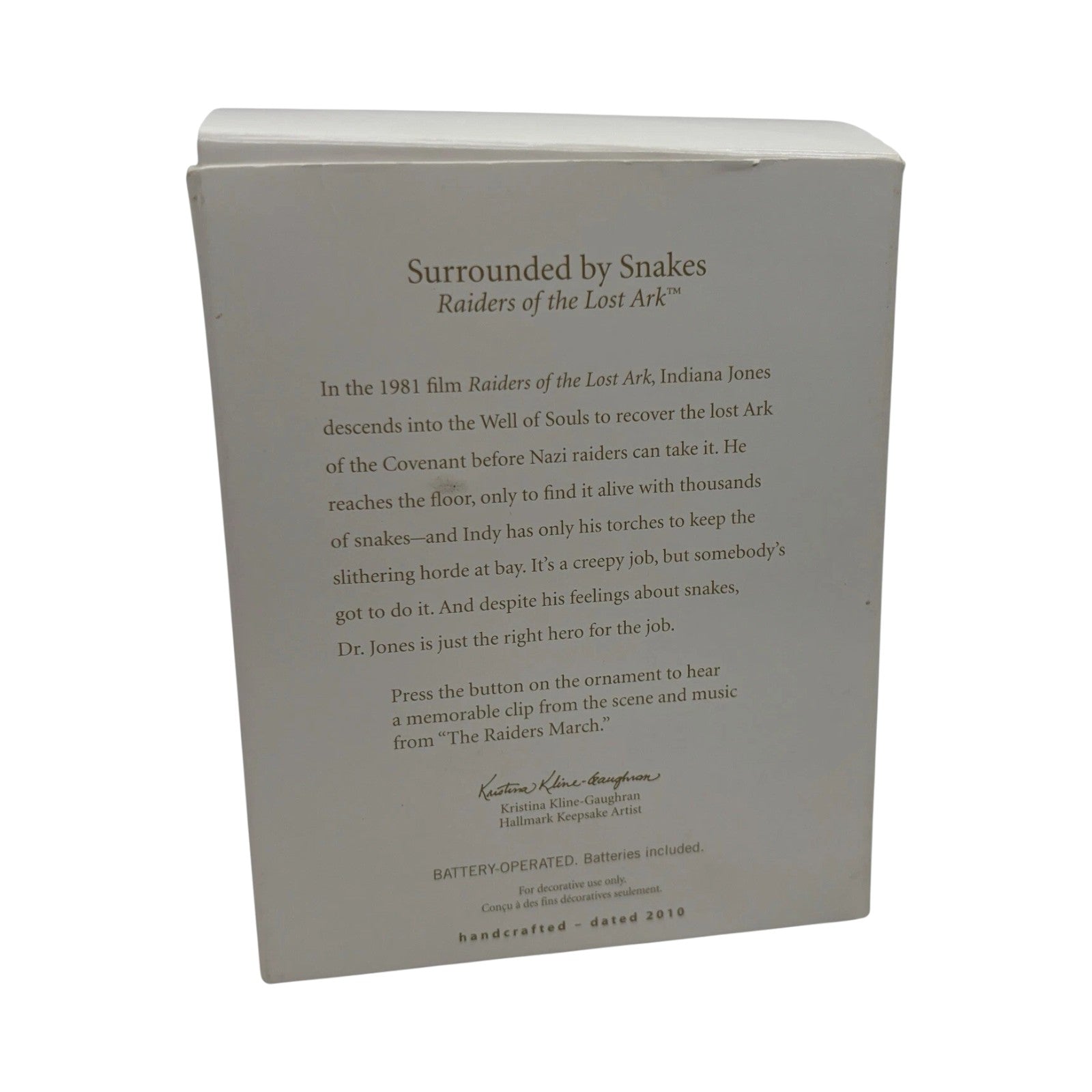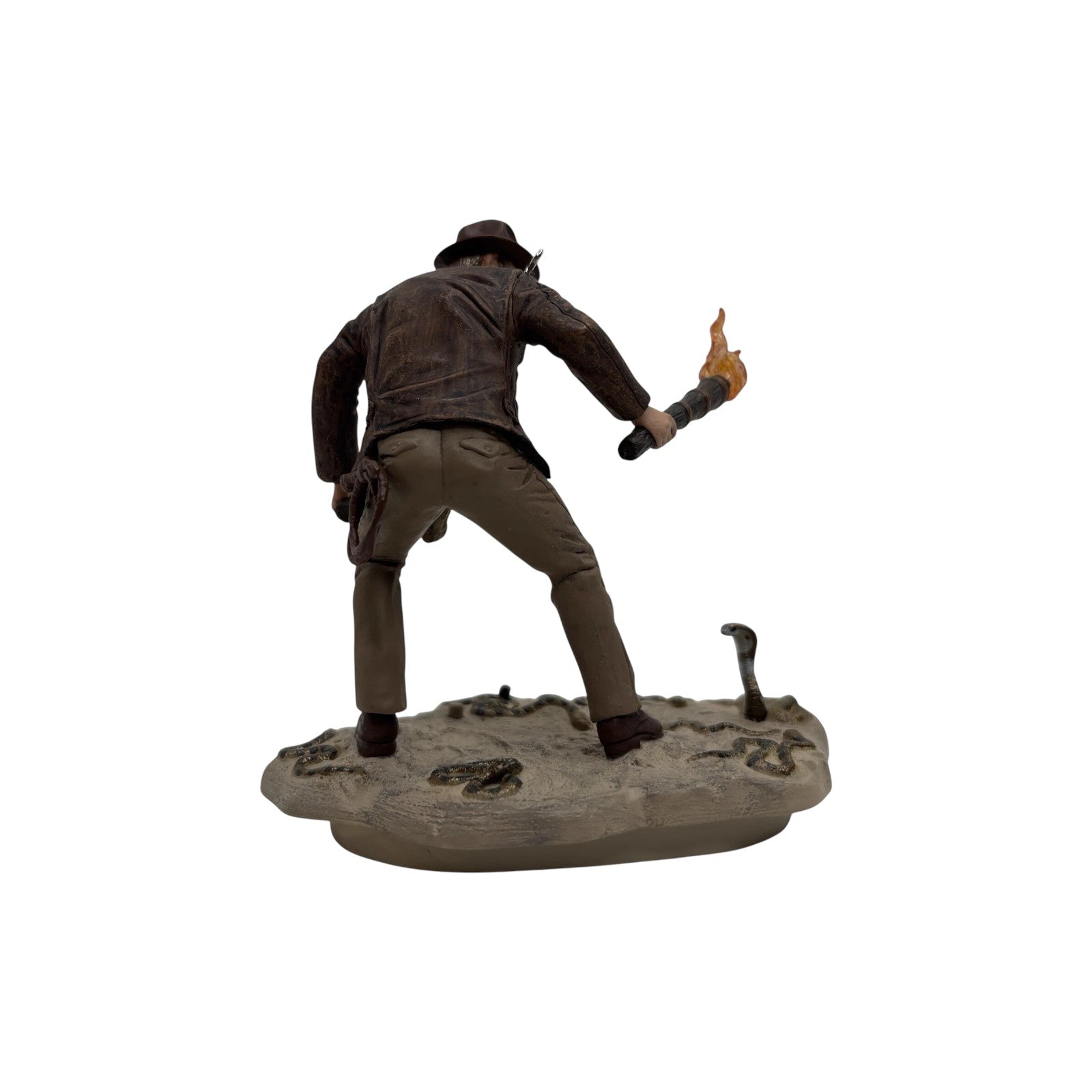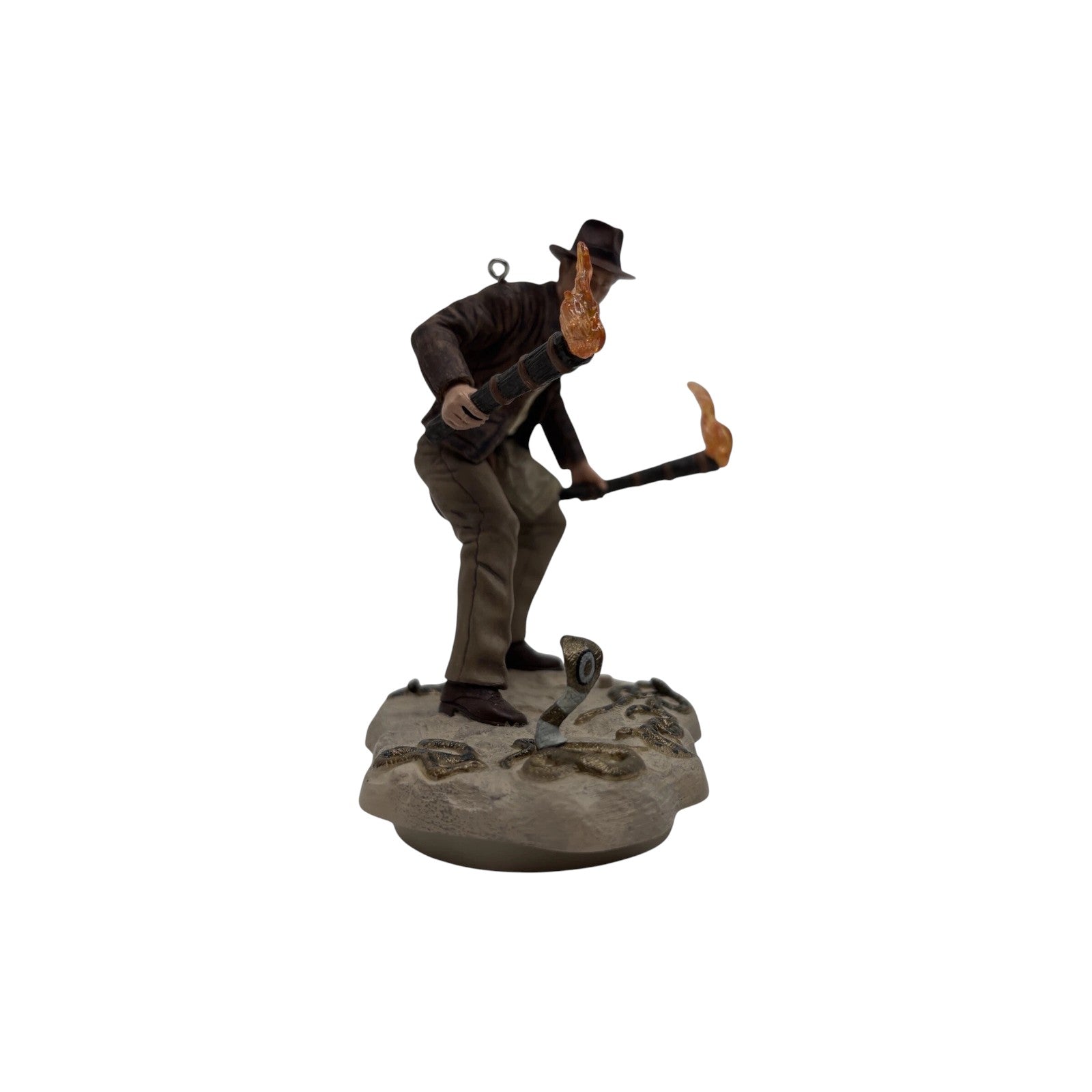 This exciting Magic-series ornament celebrates the iconic opening scene of the film “Raiders of the Lost Ark” where Indiana Jones finds himself literally surrounded by snakes. The ornament features a sculpted Indiana Jones figure rising from the well amid coiled snakes, and when activated, it plays a scene clip from the movie and music from the “Raiders March.” Created in multicolored resin and plastic, it measures approximately 4¼″ in height. Its blend of cinematic nostalgia, licensed film connection and interactive sound feature makes it a standout for cinephile collectors and holiday décor enthusiasts.