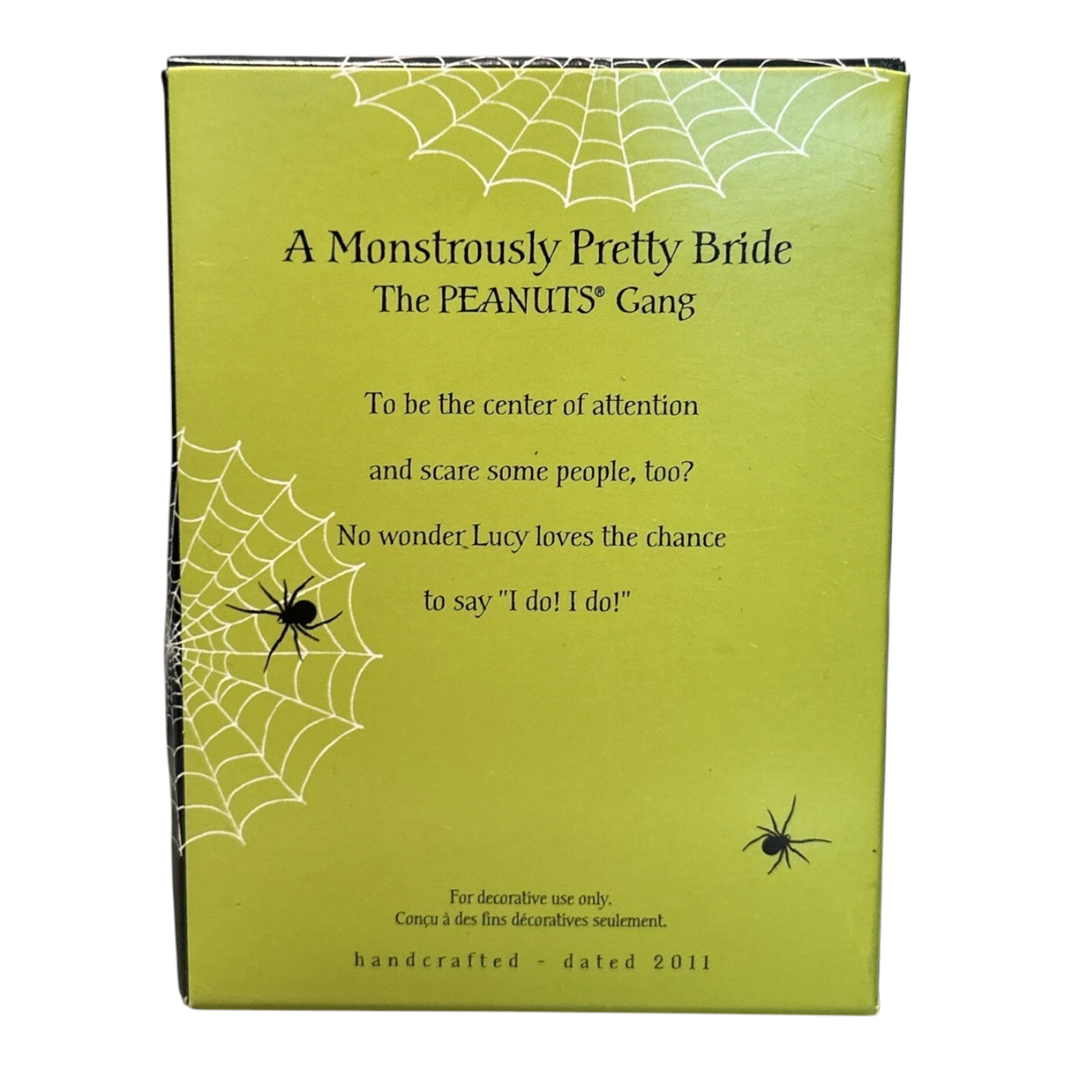 Get a festive fright for Halloween with the 2011 A Monstrously Pretty Bride (The PEANUTS Gang) Keepsake ornament. This delightfully spooky collectible portrays Lucy dressed as the Bride of Frankenstein—complete with flowing white dress, floral headpiece, and stitched detailing—perfect for Peanuts and Halloween fans alike. Packaged in its original Hallmark Keepsake box bearing Peanuts branding and including the protective inner tag, it's ready to display, store, or spook up a holiday collection. No batteries, cords, or light strings are needed—just charming Halloween style in traitor‑blue form.