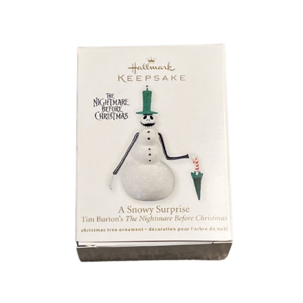 Jack Skellington takes on the role of a spooky snowman in this quirky 2011 A Snowy Surprise ornament from The Nightmare Before Christmas series. Created by Sharon Visker, it features Jack’s skull-faced snowman character wearing a green top hat and holding a candy-cane umbrella. Made of mixed materials and plastic, it arrives in its original Hallmark Keepsake box with tag. No batteries, cords, or lights are needed—just unwrap and hang this whimsical holiday treat.