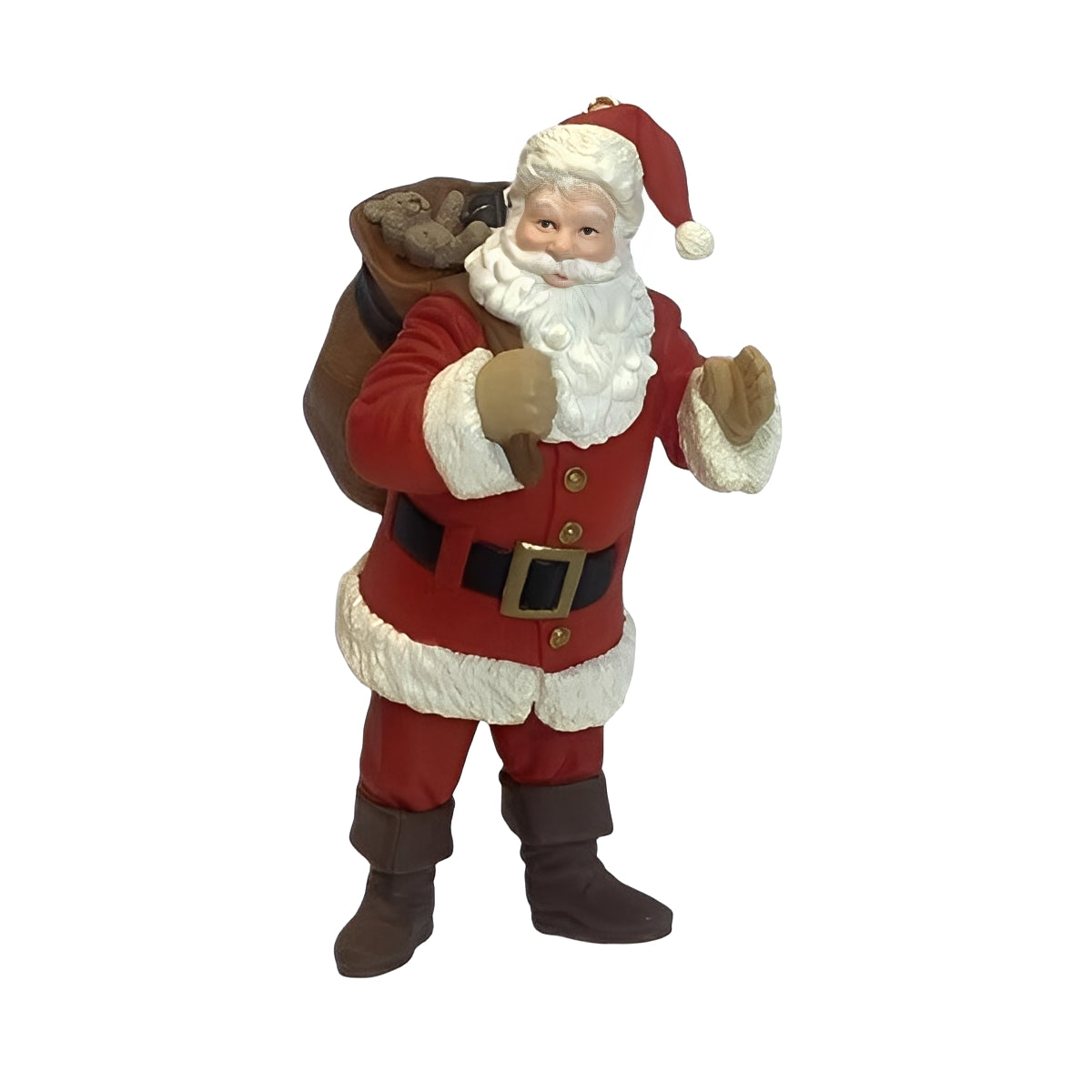 This enchanting Hallmark Keepsake ornament captures a classic Christmas scene: Santa Claus dressed in red, carrying a generous bag of toys for all the good children.