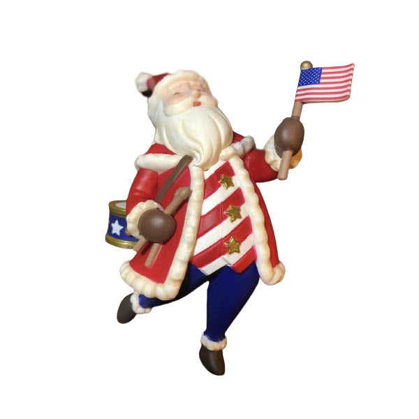 This vibrant 2011 keepsake ornament features a patriotic version of Santa Claus—dressed in red, white and blue—with stars on his jacket buttons, holding an American flag in one hand and a drum strapped over his shoulder. It blends classic holiday imagery with U.S. patriotic flair, making it a striking piece for collectors who enjoy Americana-themed décor. Because the design ties holiday tradition to national pride, it appeals both as a seasonal ornament and a collectible expression of patriotic sentiment.