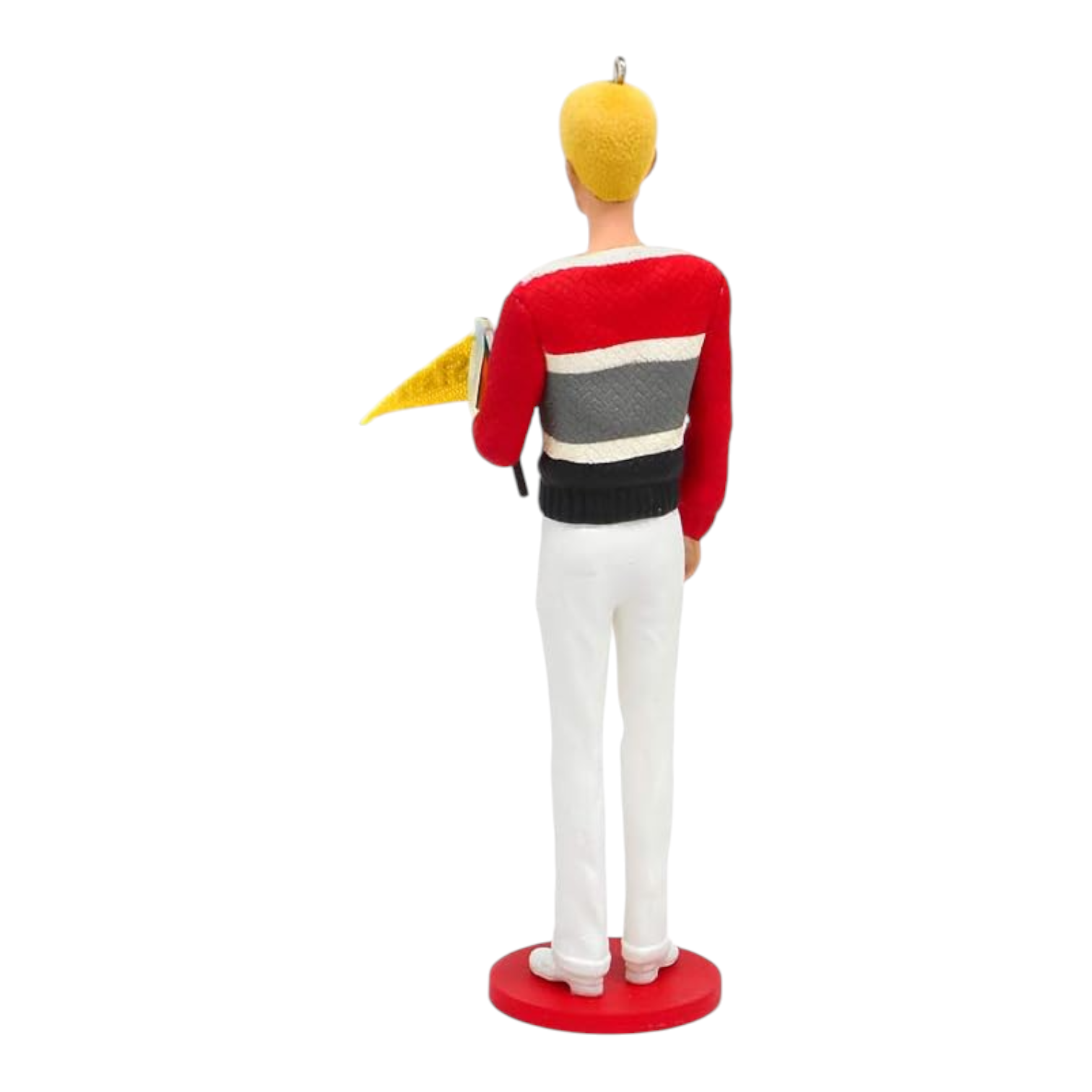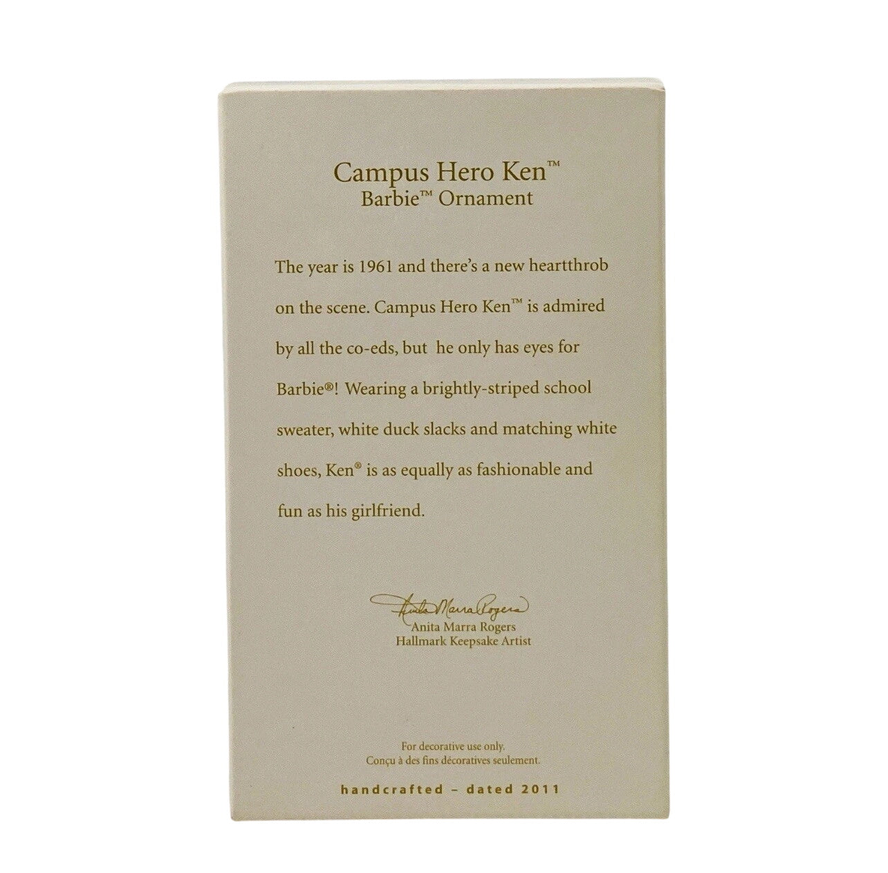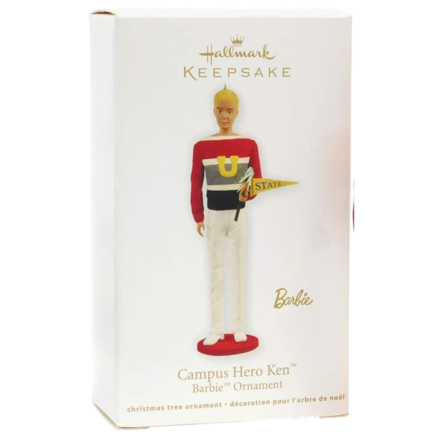 Meet the 2011 Campus Hero Ken (Barbie) ornament, a stylish nod to 1961’s college charm. Dressed in a brightly striped collegiate sweater, white duck slacks, and matching shoes, Ken stands confidently while holding a pennant flag—capturing a nostalgic, youthful energy. Designed by Anita Marra Rogers as a Hallmark Gold Crown exclusive, this keepsake comes beautifully packaged with the ornament, a Keepsake box, and Hallmark tag. No batteries or cords needed—pure retro appeal for your tree or collection.