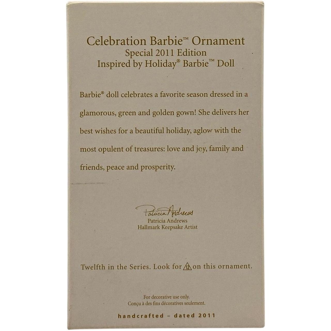 This enchanting 2011 Celebration Barbie ornament, the 12th in the beloved series, draws inspiration from the Holiday Barbie Doll. She dazzles in a rich emerald-green gown with opulent gold accents, flowing skirt layers, and long blonde curls—all crafted with meticulous detail. She arrives in the original Hallmark Keepsake box complete with tags. There are no batteries, cords, or special lighting required—just pure festive elegance ready to grace your tree.