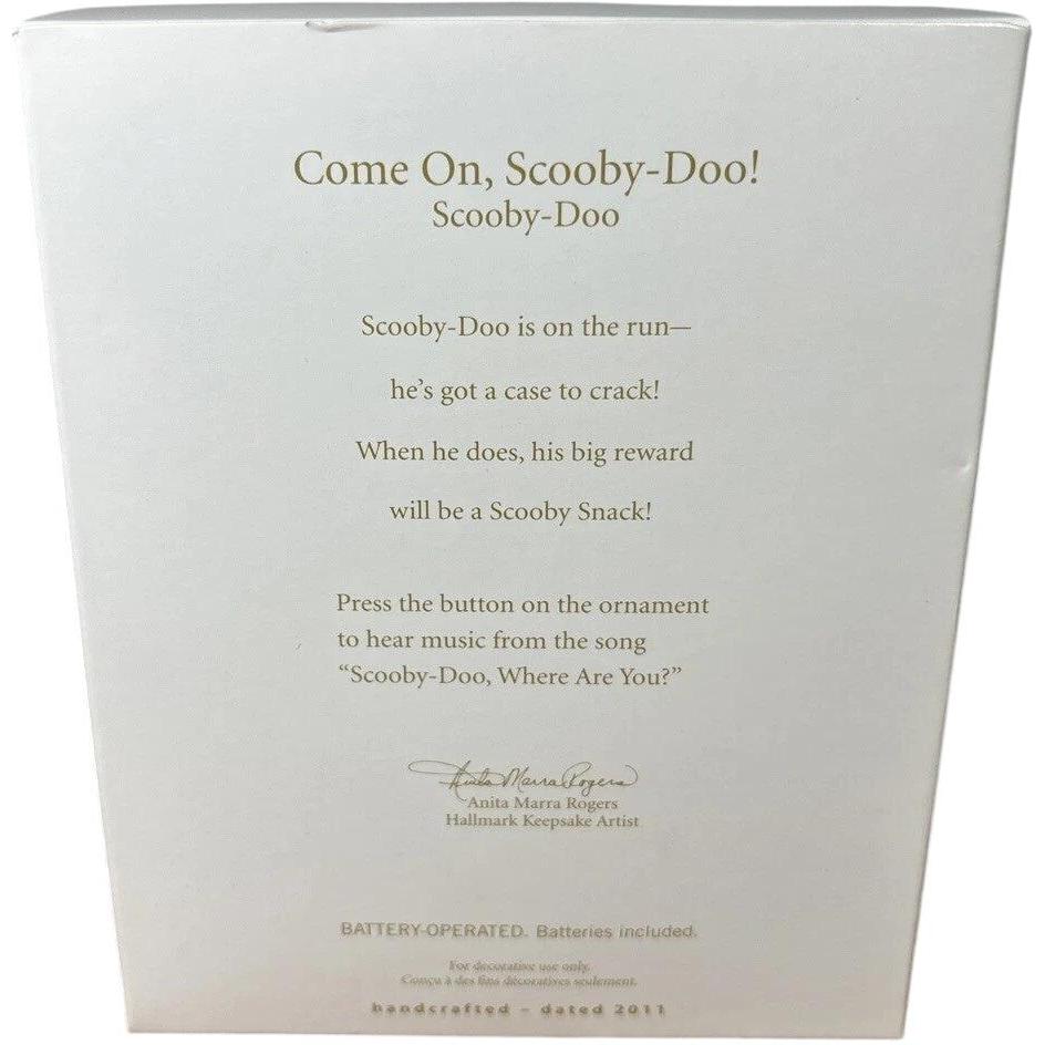 Catch Scooby and the gang in action with 2011 Come On, Scooby-Doo!, a magic Keepsake ornament that brings music and mystery to your holiday tree. This ornament shows Scooby leading the chase—running after the thief—with Shaggy, Velma, Fred, and Daphne faintly visible in the background. Press the button to hear part of the Scooby-Doo theme song. Comes with 3 LR44 batteries included; no cords or light strings needed. Original box included when available. Designed by Anita Marra Rogers.