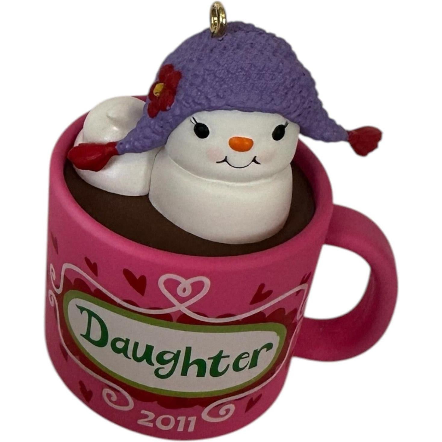 Celebrate your daughter's sweet spirit with the 2011 Daughter ornament. Shaped like a bright-pink mug reading "Daughter 2011," it’s topped with hot chocolate and a marshmallow snowgirl wearing a purple hat with red accents. Designed by Terri Steiger, this charming keepsake makes an ideal gift for daughters big and small. It arrives in its original Hallmark Keepsake box—no batteries or cords required, just heartfelt memories.
