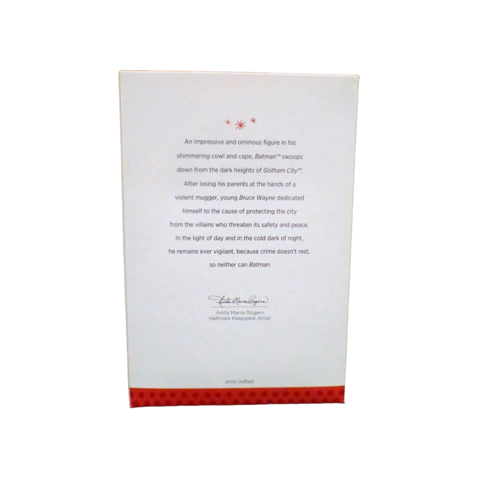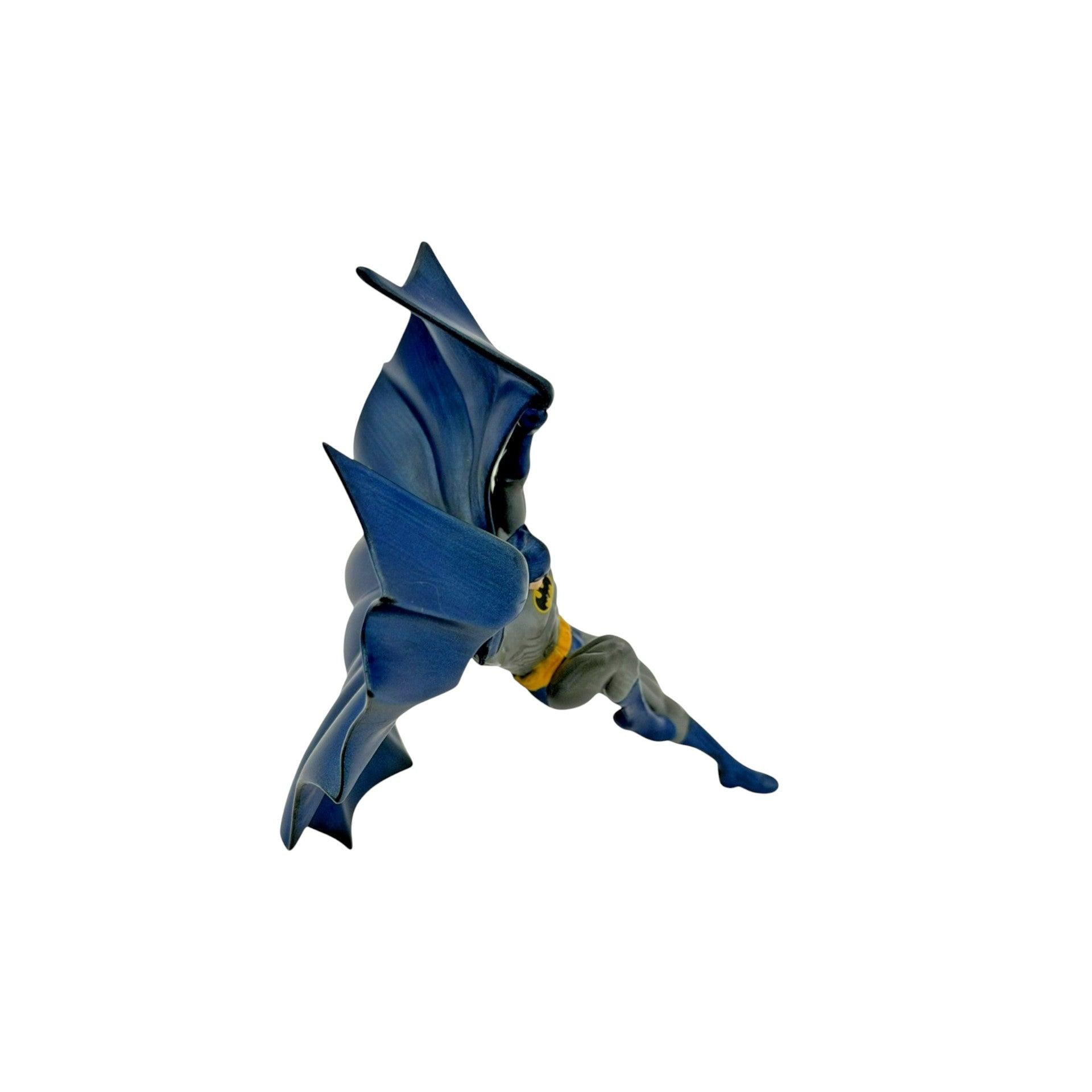 Released as a 2011 Comic-Con exclusive, “Descending Upon Gotham” captures Batman in a dramatic mid-swoop pose, arms raised and cape flared into a bat-wing silhouette as he drops into action above Gotham. This is a special repaint/colorway of Hallmark’s earlier “Descending Upon Gotham” sculpt, updated with a modern gray-and-black Batsuit look for the convention release. The ornament comes new in its original Hallmark SDCC event box with insert/packaging as sold at the show, and it was production-limited to just 750 pieces, making it one of the tougher modern Batman Keepsakes to track down. It’s non-lighted and non-animated, so no batteries, cords, power box, or light strings are required—pure display drama right out of the box.
