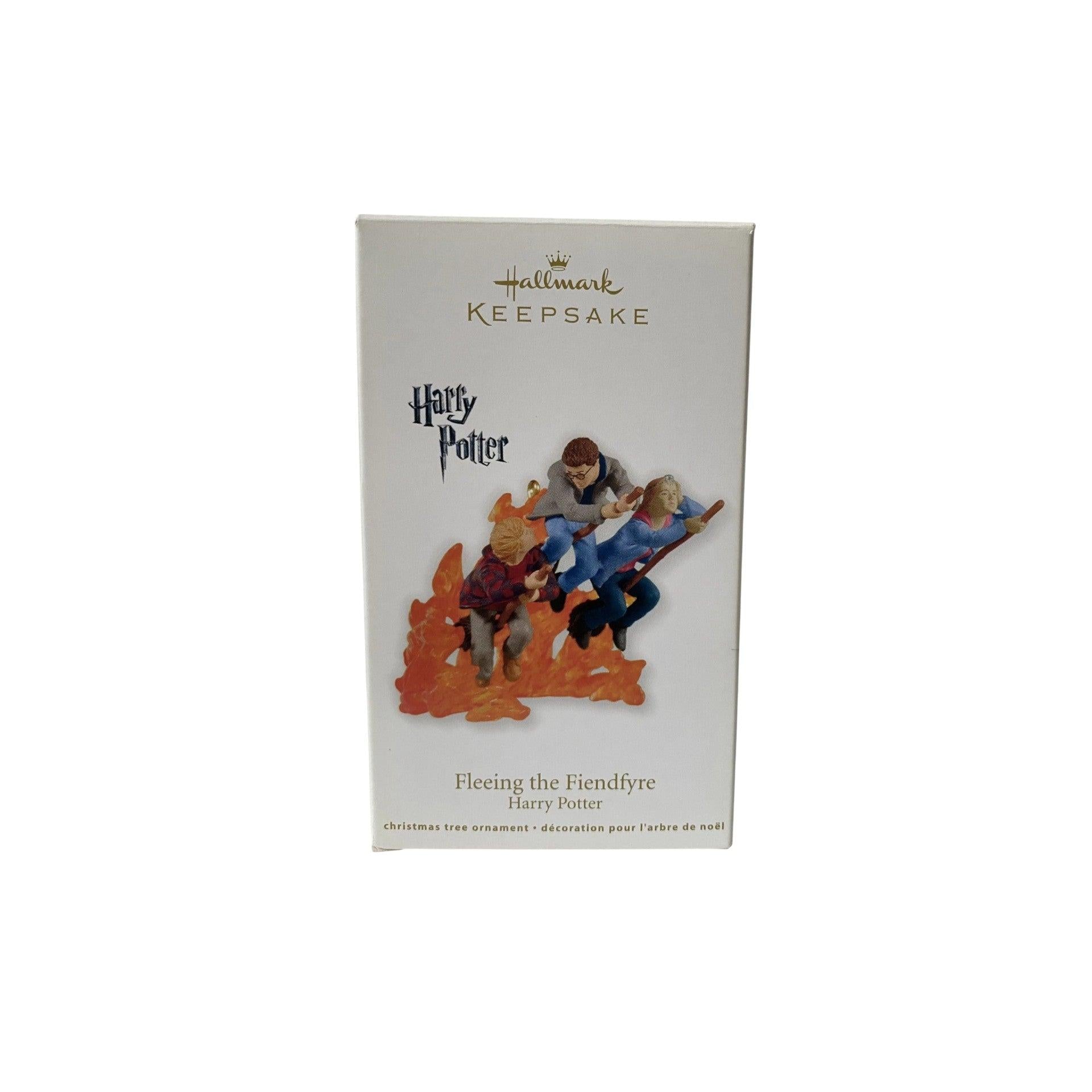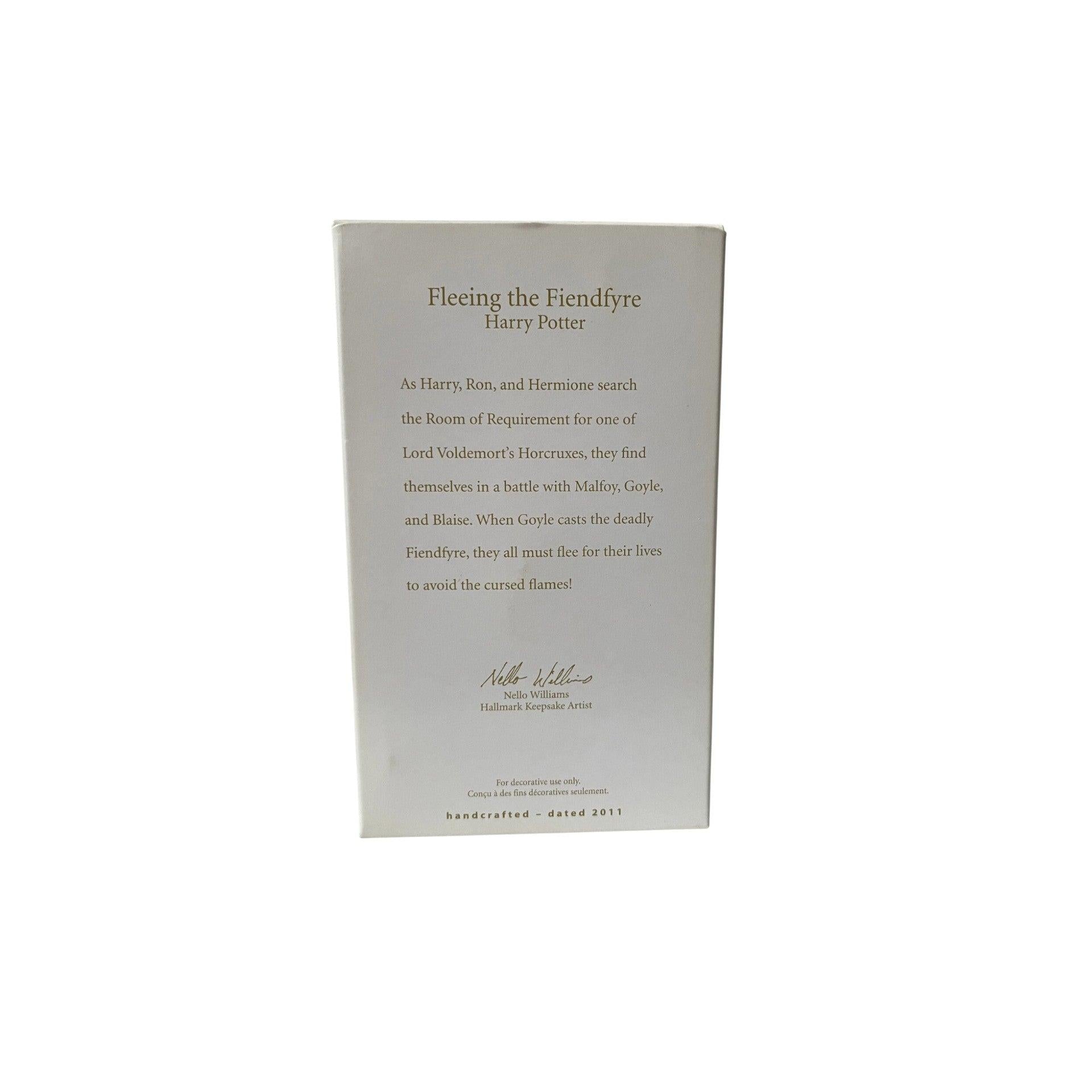 This dramatic 2011 Hallmark ornament vividly recreates the scene as Harry, Ron, and Hermione flee the murderous Fiendfyre—an enchanted inferno unleashed in the Room of Requirement. Crafted in hand-painted resin, the trio is depicted perched atop swirling translucent orange flames, evoking movement and urgency. Packaged in its original white “Fleeing the Fiendfyre” box with tag, this static collectible requires No Power Needed, making it ready to hang immediately.