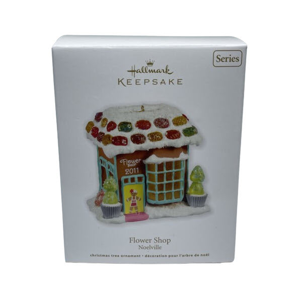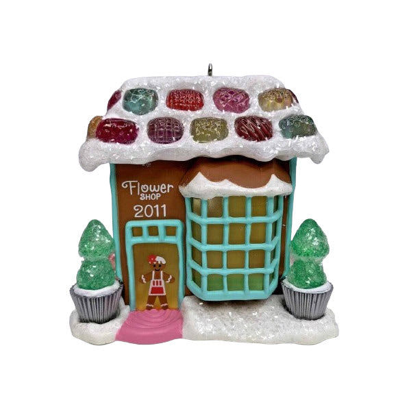 Bring a fragrant flourish and candy-shop charm to your holiday décor with the 2011 Flower Shop (Noelville #6) Keepsake ornament. This gingerbread-style building features vibrant floral displays, trimmed windows, a “Flower Shop 2011” sign above the door, and decorative candy accents all around. It includes a rubber grommet to insert the bulb of a standard miniature light string (sold separately) for a warm glow effect through the windows. Created by artist Linda Sickman, this piece comes in its original packaging (when available) with the Hallmark Keepsake tag. No batteries, sound, or cords required—just static hanging ornament with optional light string effect.