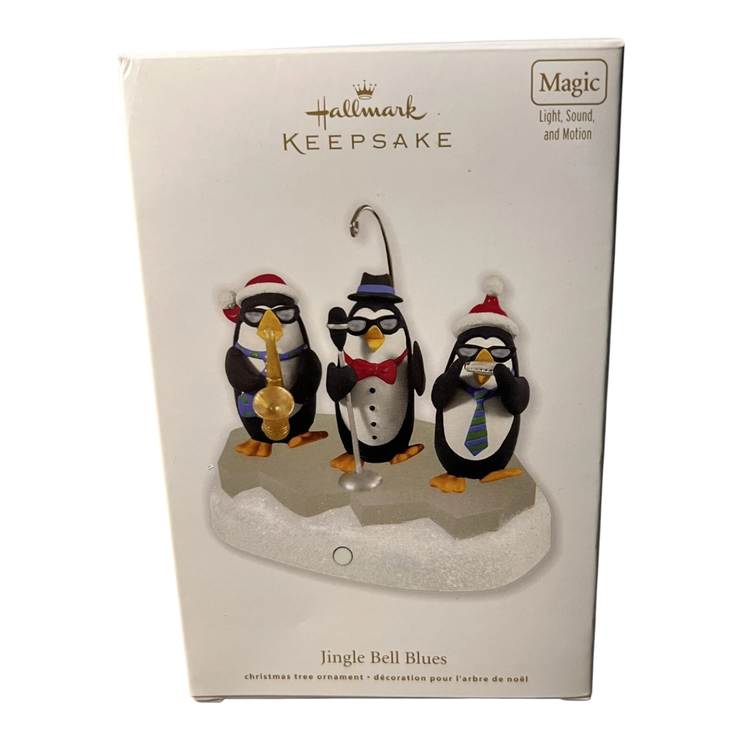 This festive “Magic” ornament by Hallmark features a trio of penguins rocking out to a blues‐style rendition of “Jingle Bells.” Press the activation button and you’ll see the base illuminate, the penguins sway and play, and hear the tune in full sound. Designed with light, motion and sound, the piece combines cheerful winter imagery with collector-friendly interactivity — ideal for both tree décor and enthusiasts of animated holiday ornaments.