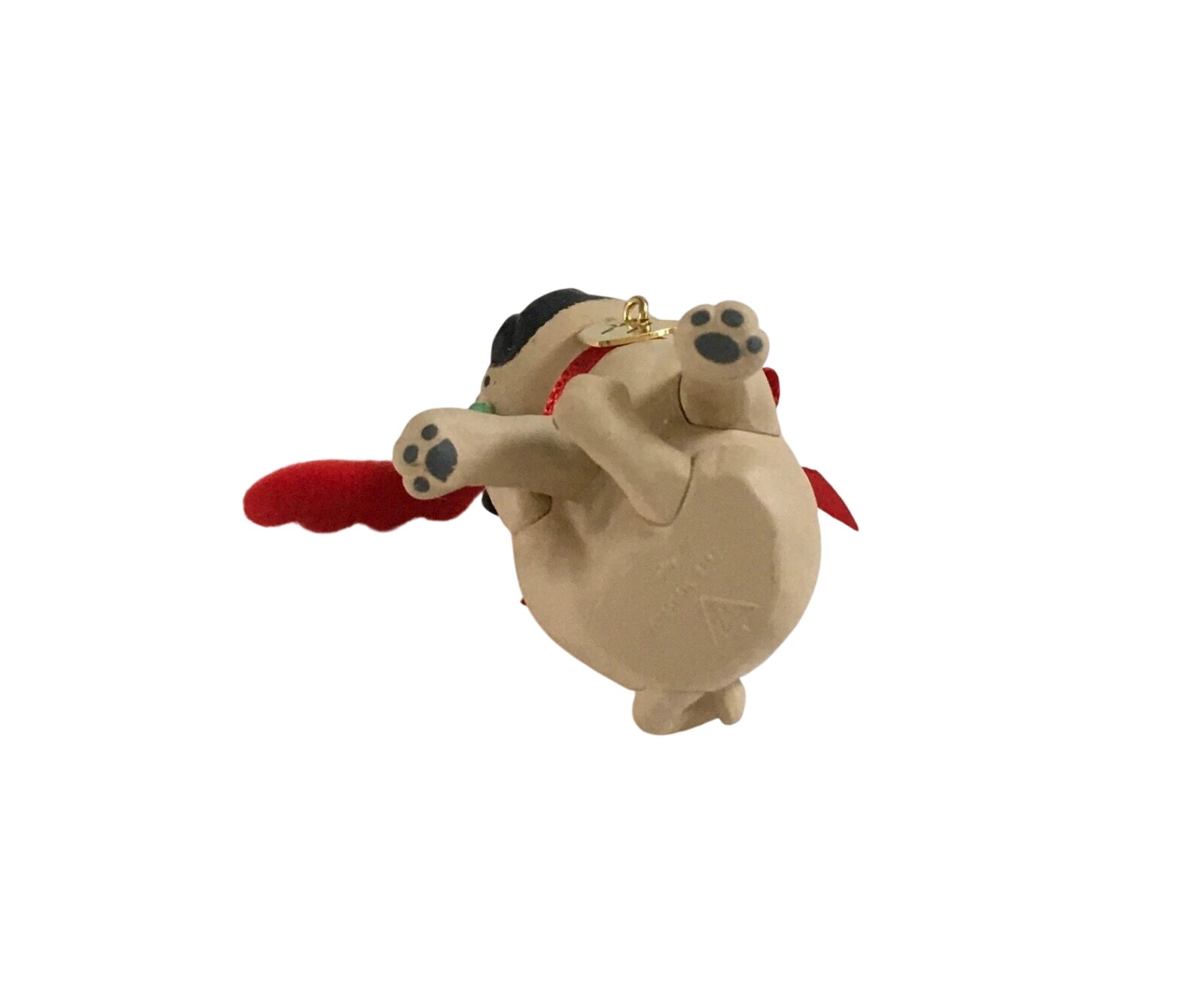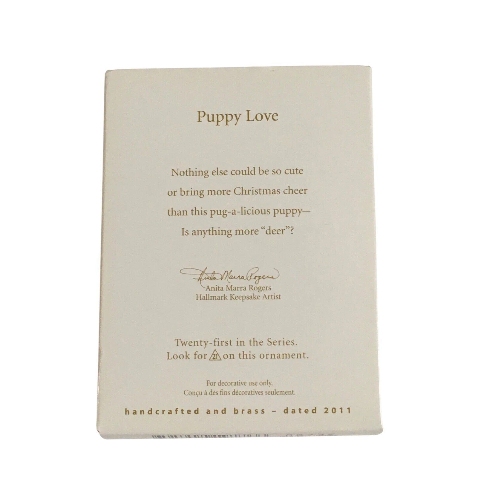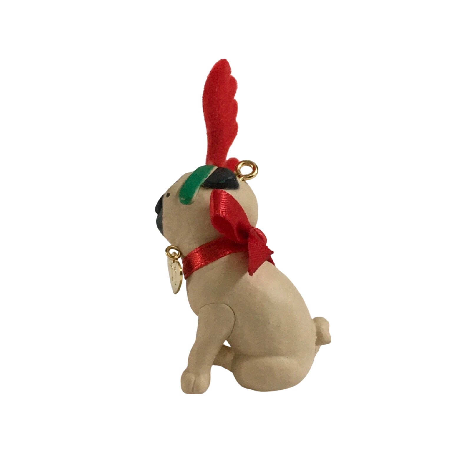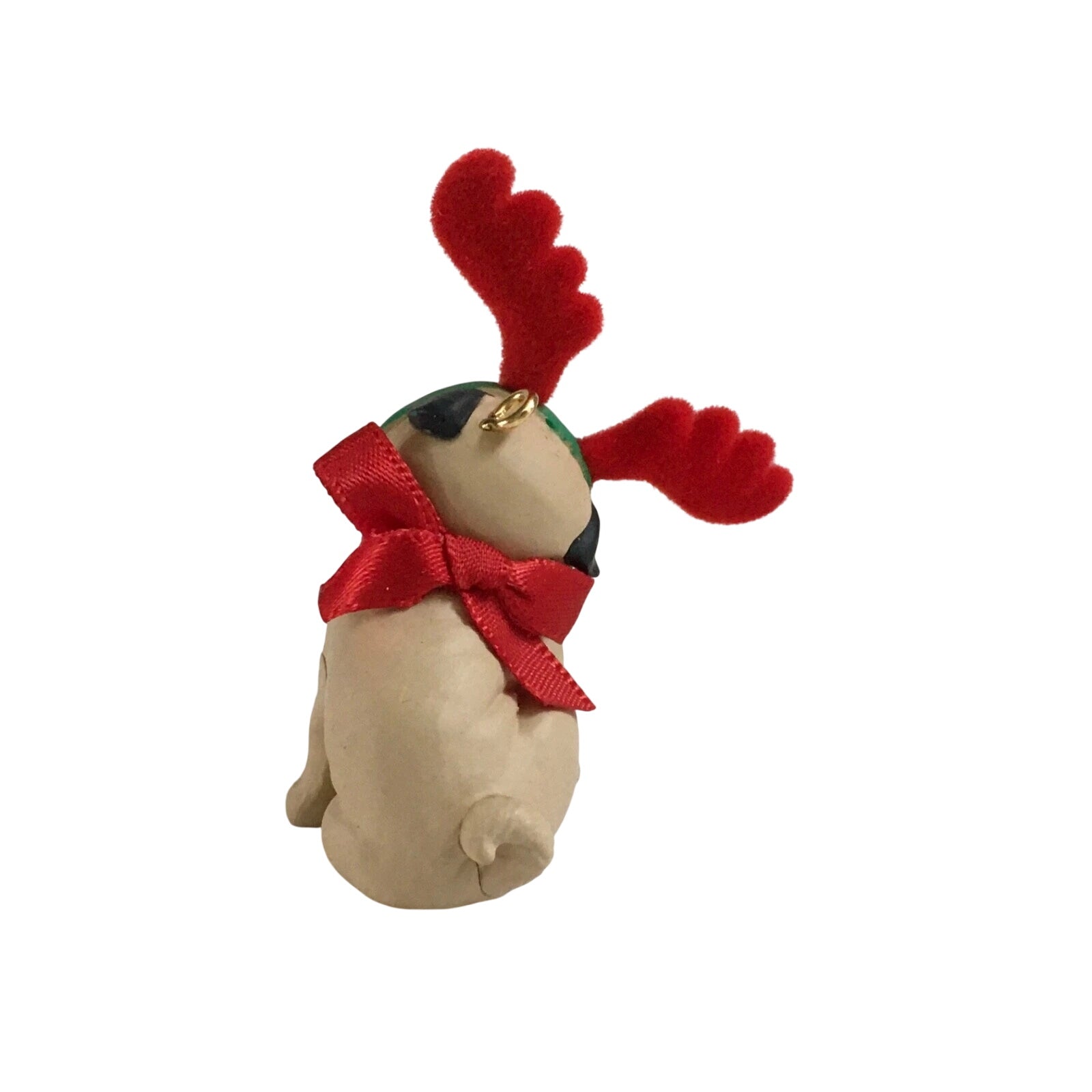 The 2011 Pug (Puppy Love) ornament features an adorable pug puppy caught in a moment of holiday mischief—wearing reindeer antlers and scratching at them, looking both cute and a little irritated. A brass heart-shaped tag stamped “11” hangs from his collar for the year. The ornament typically comes in its original box, ideal for collectors, though box condition may vary depending on storage.