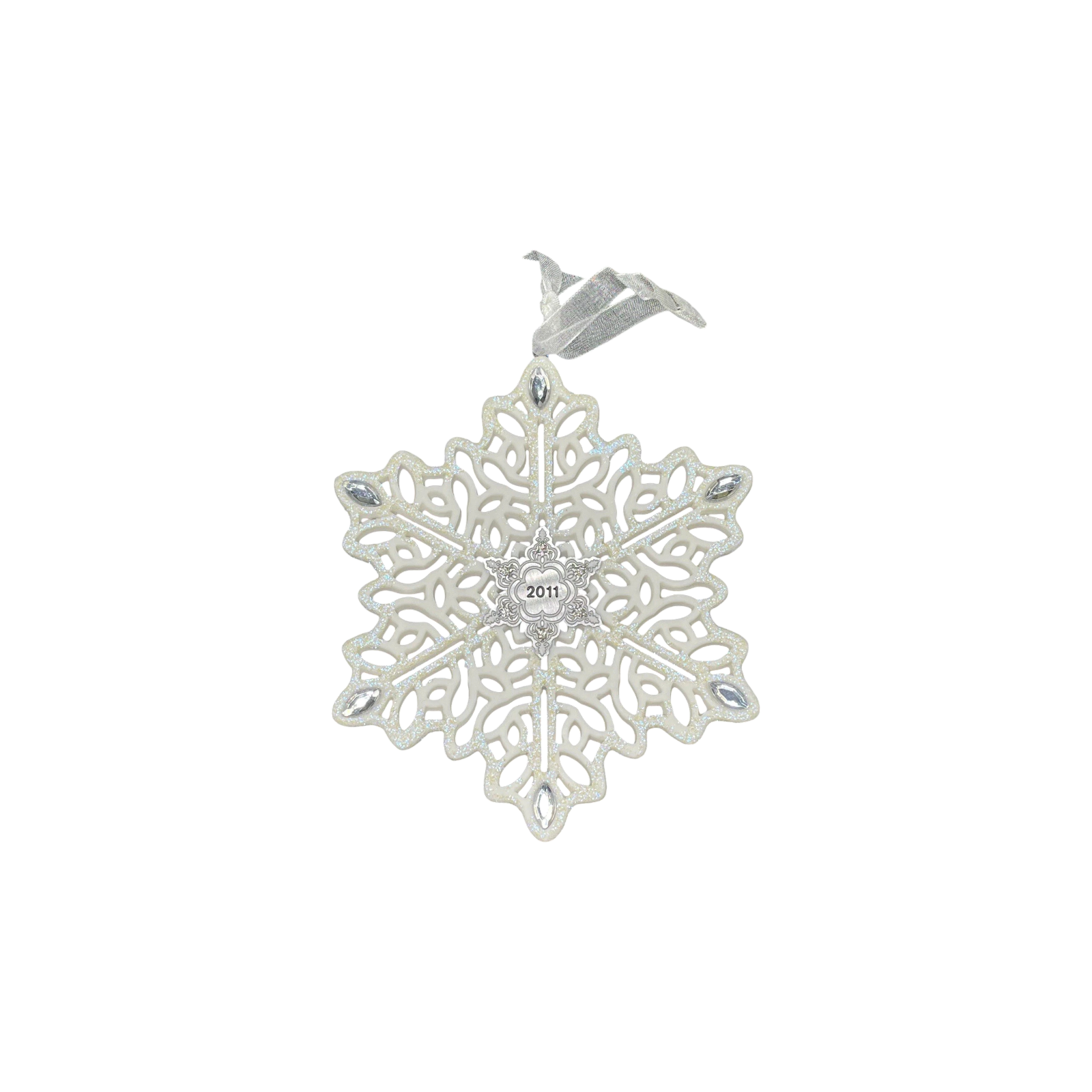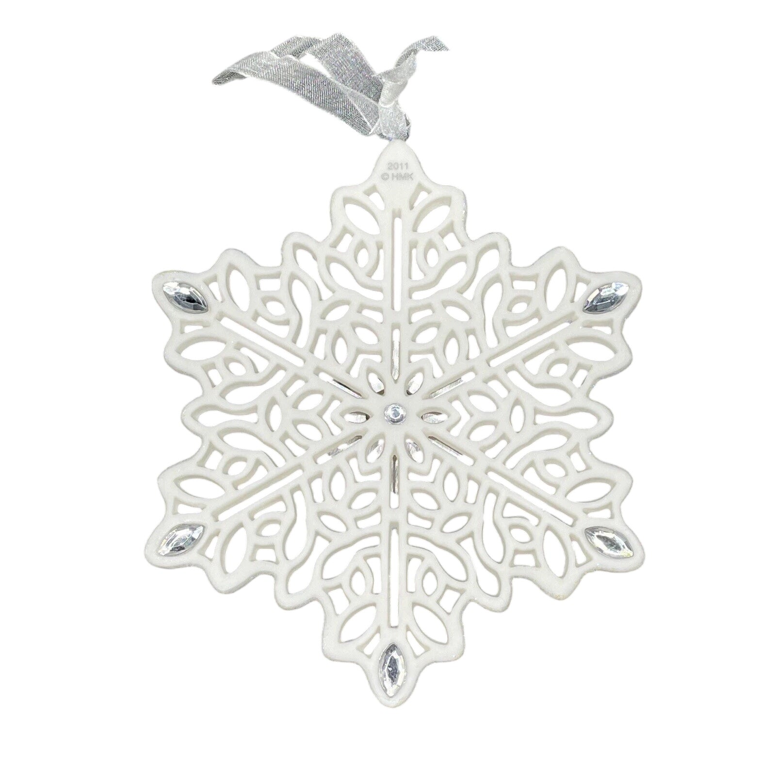 Celebrate the 2011 edition of Hallmark’s beloved annual Snowflake series. Crafted of elegant white porcelain with a central silver-toned metal snowflake dated “2011,” this ornament features subtle glittering accents for a refined winter sparkle. Arrives mint in its original Keepsake box with hang tag and clamshell—no power or batteries needed. A timeless touch of holiday sophistication!