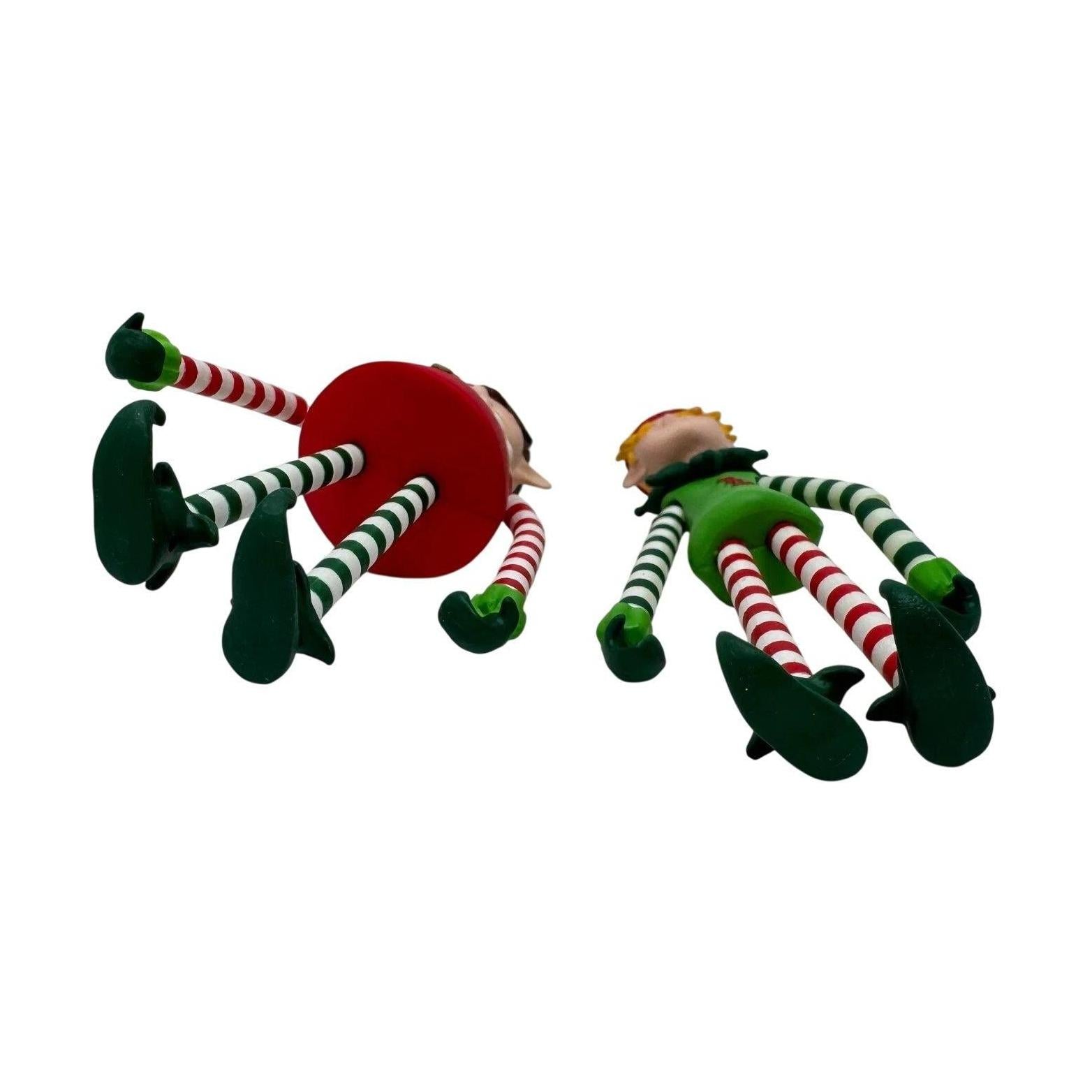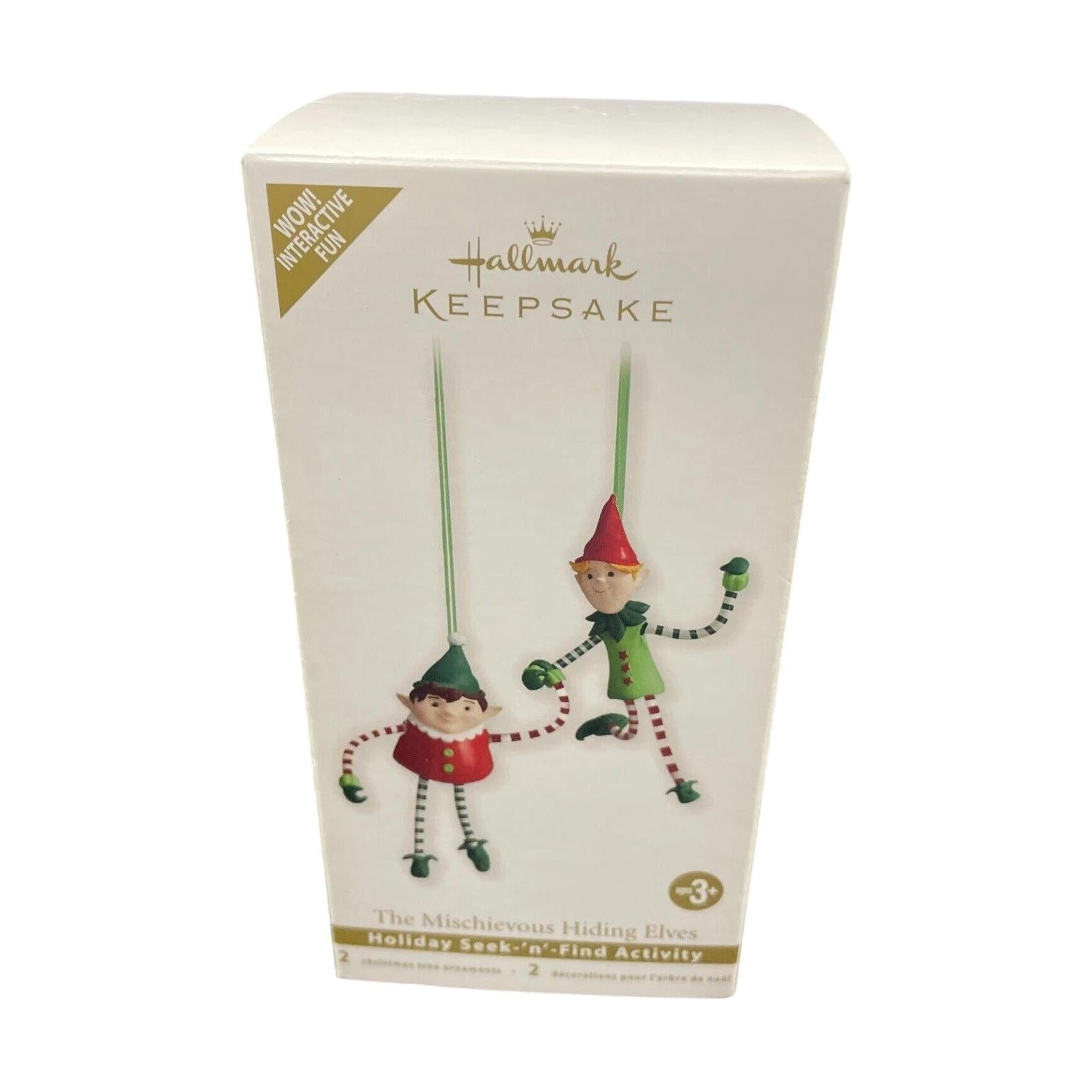 This playful set features two bendable-arm and leg elves named Jingle and Jangle, designed to be hidden throughout the tree and then found and reunited by eager helpers. The elves are dressed in candy-striped attire and include flexible limbs that hook together, adding an interactive element to holiday decorating. The vibrant red and green coloring along with the dynamic poses capture mischievous holiday fun for families and collectors alike. Because the set invites a “seek and find” game, it stands out among typical static ornaments and appeals to both children and adult collectors. Produced for the 2011 line by Hallmark, this ornament set is a fun and memorable addition to any keepsake collection.