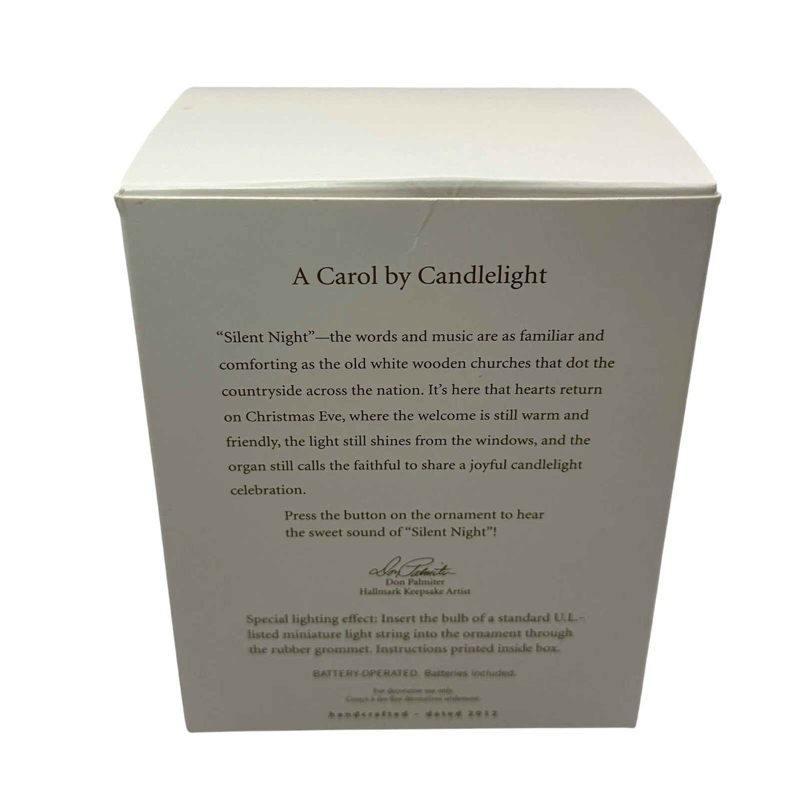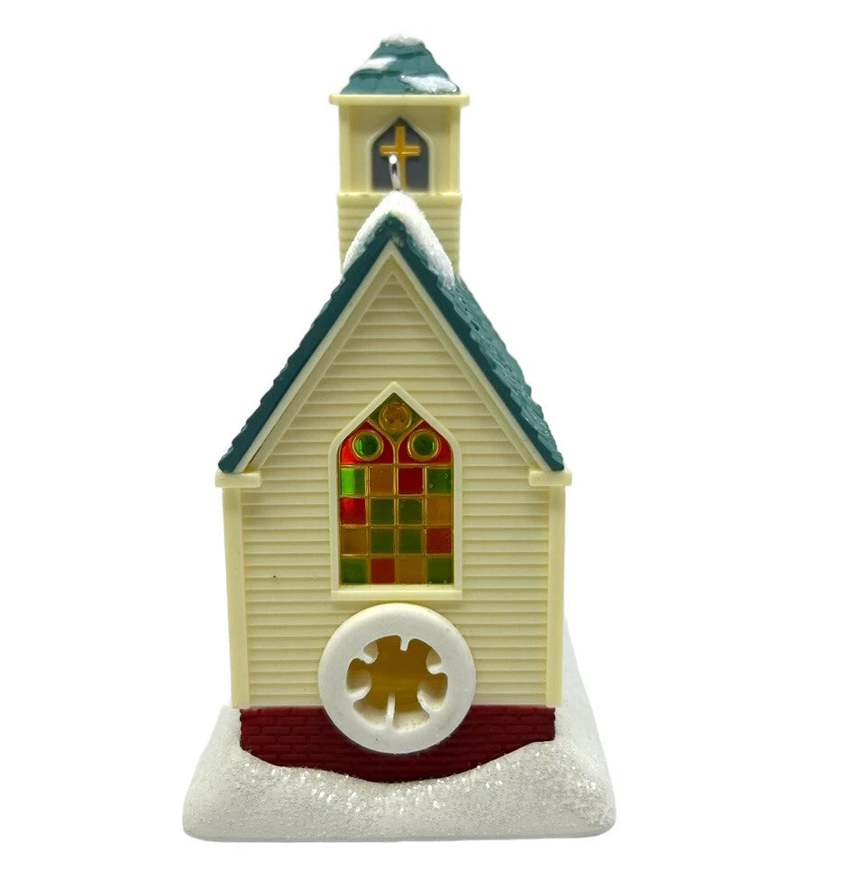 Bring the serenity of a candlelight service into your holiday décor with this touching 2012 A Carol by Candlelight ornament. Modeled as a quaint white country church in a wintry landscape, the piece features translucent windows that light up and fill with glow when attached to a standard miniature light string. Press the hidden button and it softly plays “Silent Night” — creating a magical, spiritual moment on your tree.