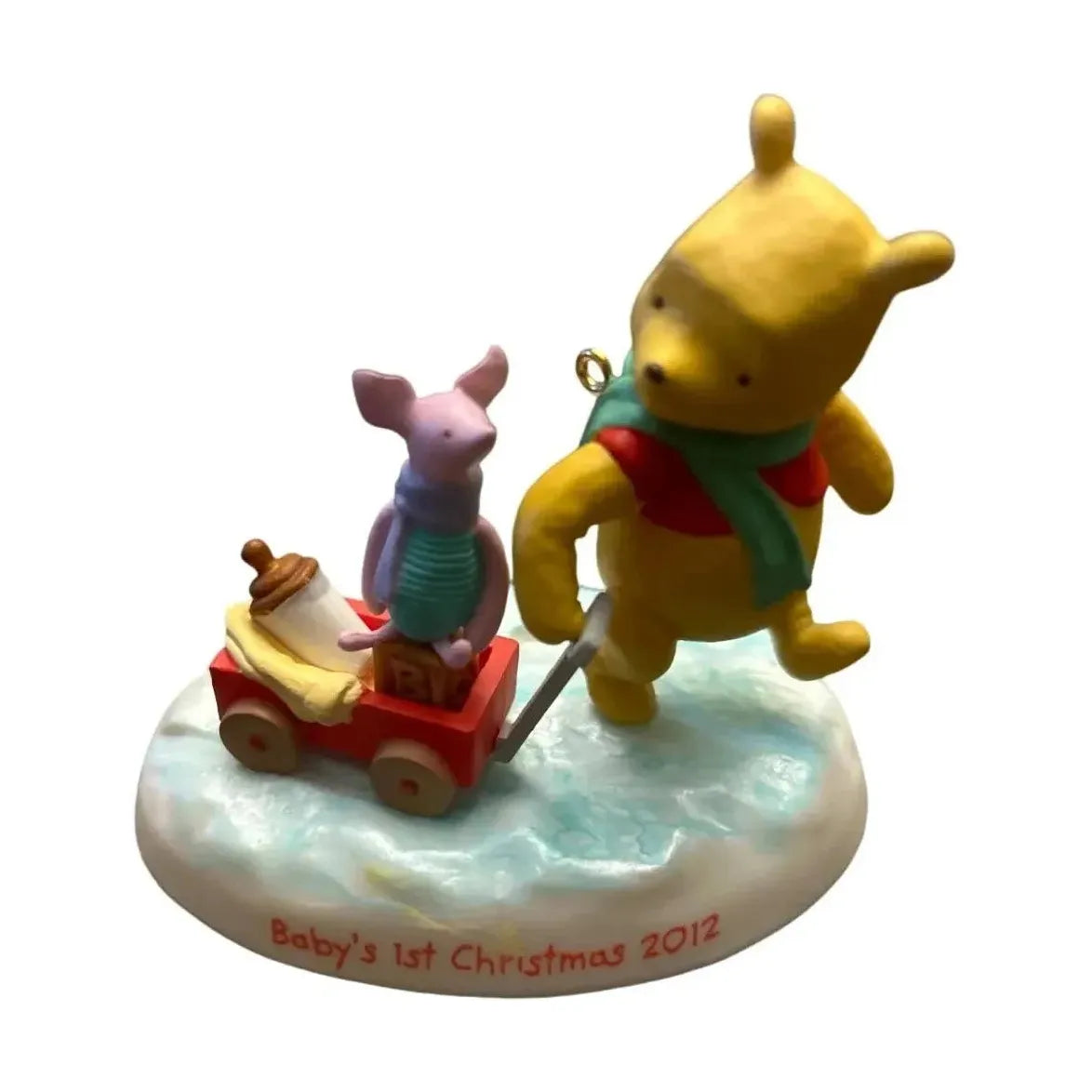 This ornament from the 2012 Keepsake collection by Hallmark features beloved characters Winnie the Pooh and Piglet in a gentle, celebratory baby-theme design. Winnie the Pooh is shown pulling a wagon filled with baby gifts (a blanket, bottle, block), with Piglet riding along, and the piece is inscribed with the phrase “Everything’s new and full of wonder.” and the year “Baby’s 1st Christmas 2012”. The design evokes both the holiday and the milestone of a first Christmas, making it suitable for new baby celebrations and keepsake collections.