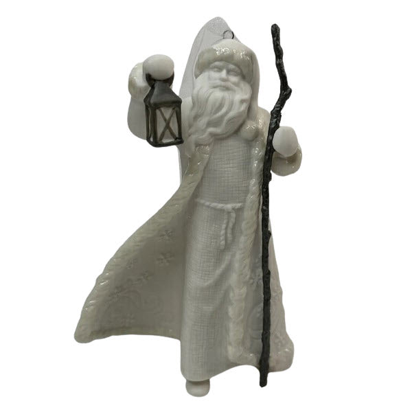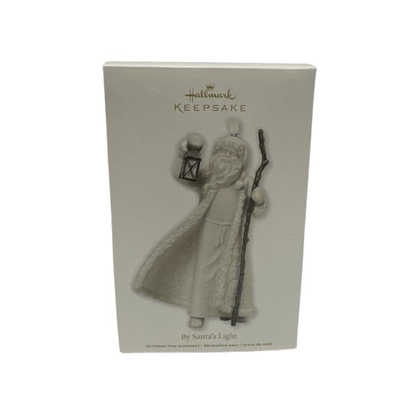 Illuminate your holidays with the serene glow of By Santa’s Light, a 2012 Gold Crown–exclusive ornament from the Father Christmas collection. Crafted from porcelain and metal, this elegant piece depicts Santa in a Victorian-inspired white coat, gently lifting a lantern in one hand and stabilizing himself with a staff in the other—as if lighting the way through the night. Arrives mint-in-box with original packaging and hang tag. It’s a purely decorative treasure—no batteries or cords needed.