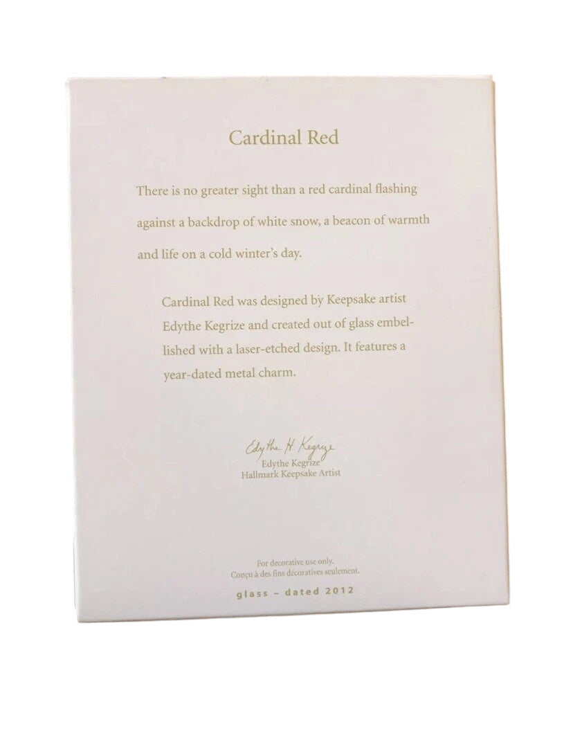 Add elegance and natural beauty to your tree with the 2012 Cardinal Red keepsake ornament. This stunning Northern Cardinal is crafted from translucent red glass with delicate white accents, creating a jewel-like effect under the holiday lights. It hangs gracefully from a white satin ribbon, while a gleaming silver medallion engraved with “Christmas 2012” completes the design. Originally a Hallmark Gold Crown Exclusive, this piece was designed by Edythe Kegrize.