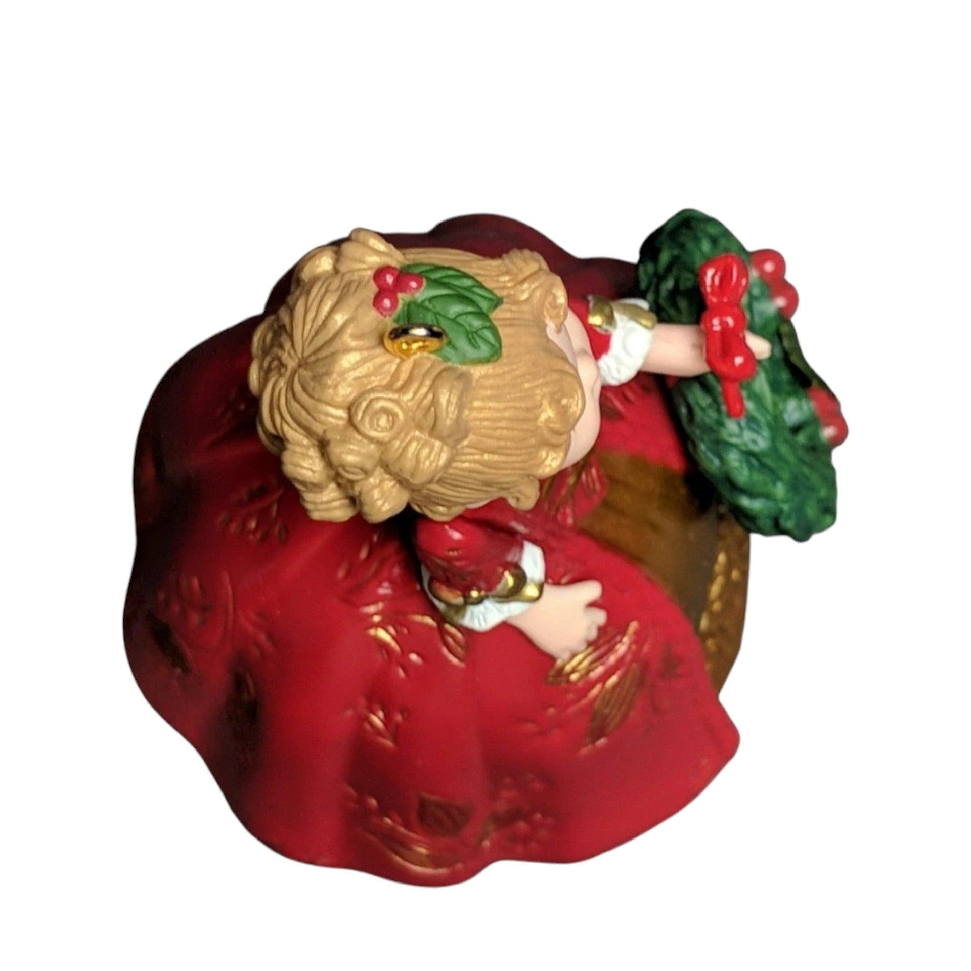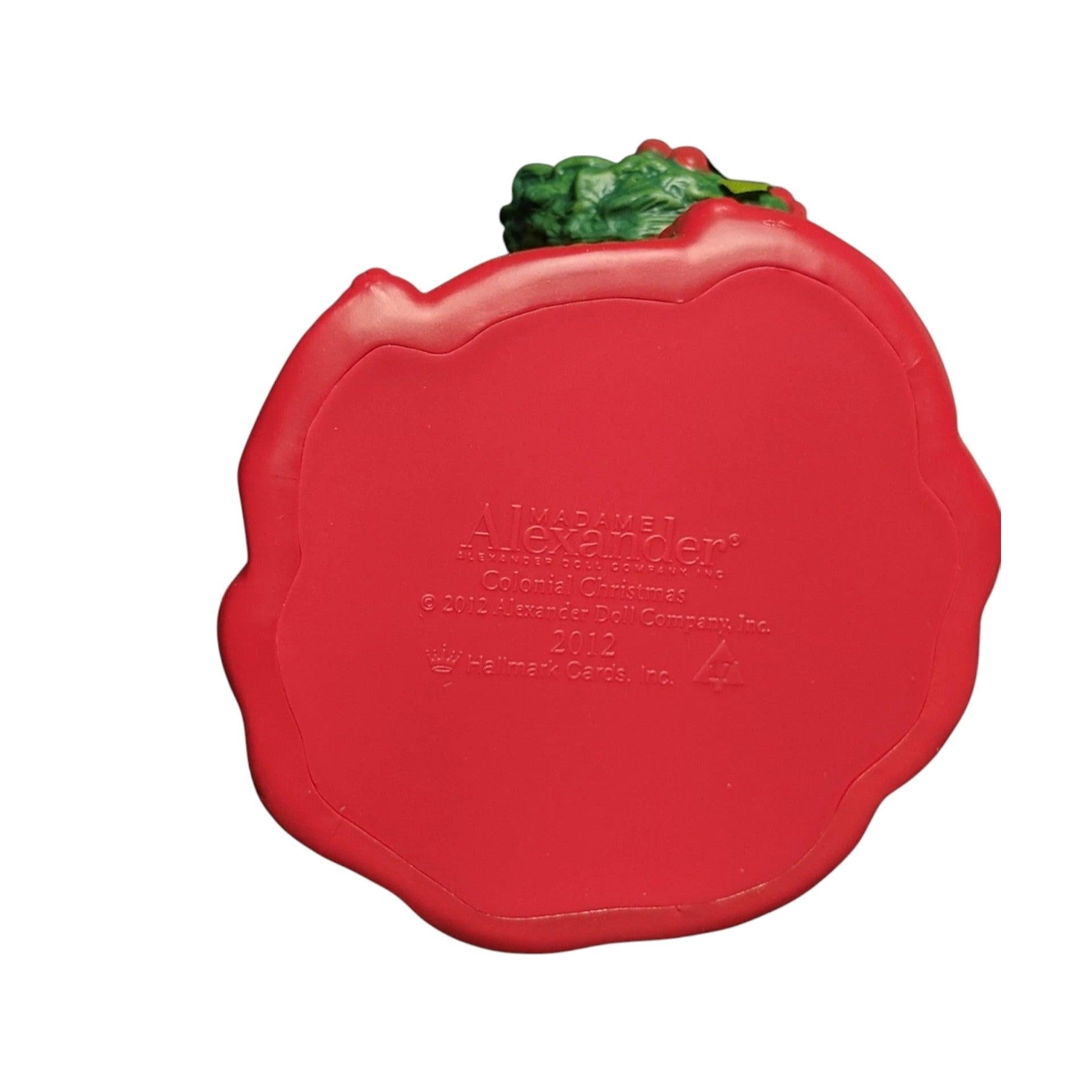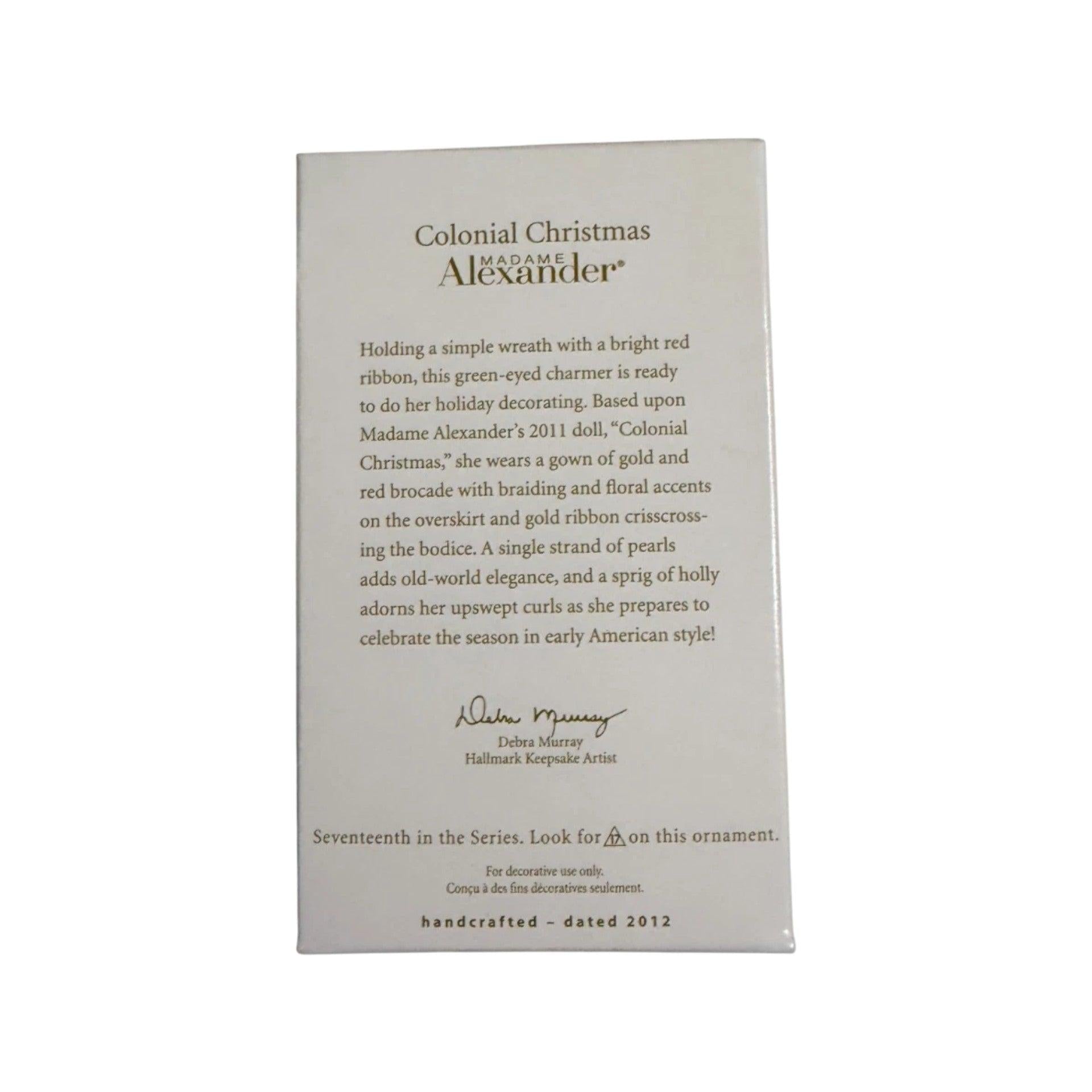 Step into early American elegance with Colonial Christmas, the seventeenth ornament in Hallmark’s 2012 Madame Alexander series. This refined keepsake portrays a colonial-era lady in a sumptuous red gown accented with gold detailing, holding a lush green wreath. The resin figure incorporates shimmering fabric-like paint for depth and grace, standing approximately 3¼″ tall. It comes complete with its original Keepsake box and tag, and requires No Power Needed—ready to hang and add historical charm to your holiday décor.