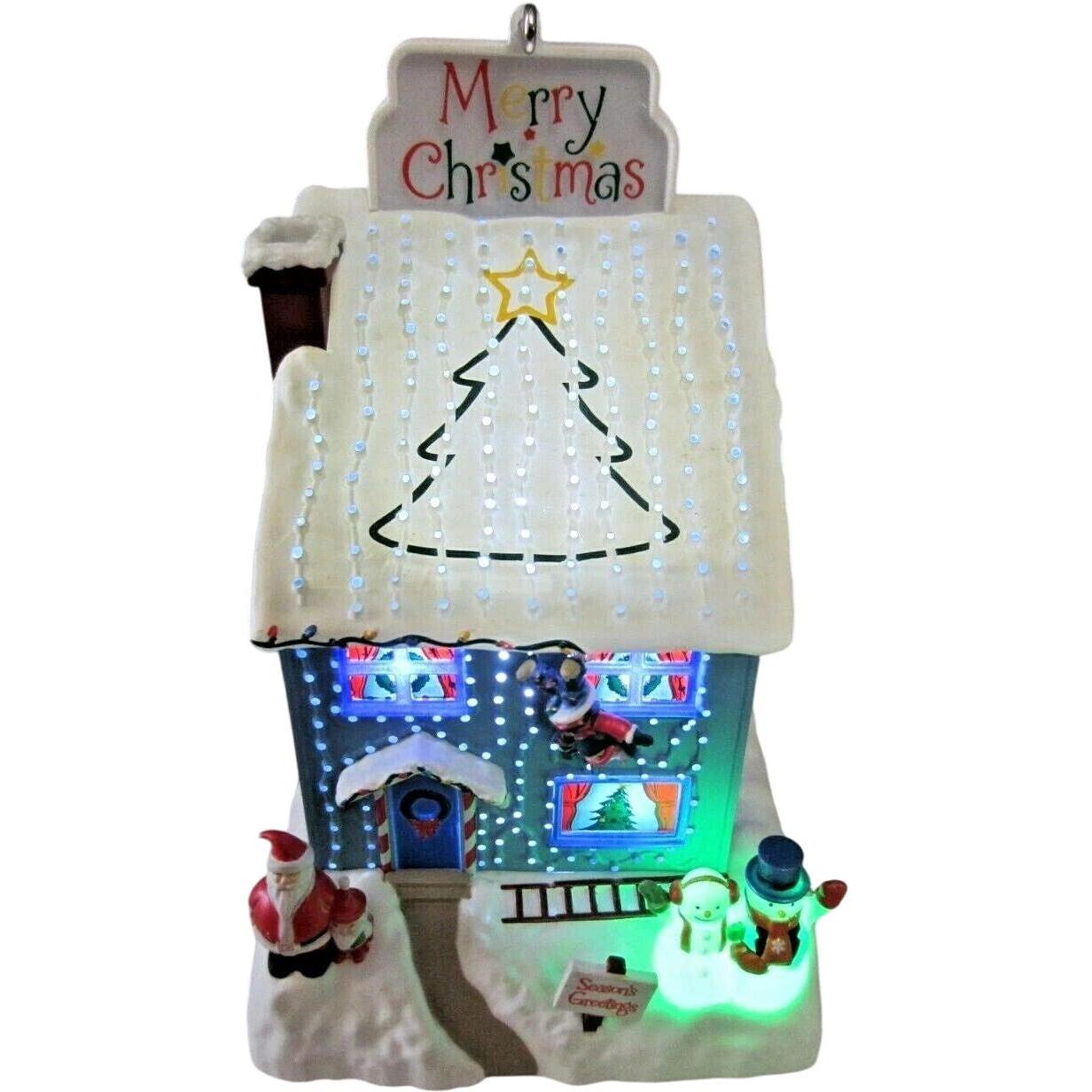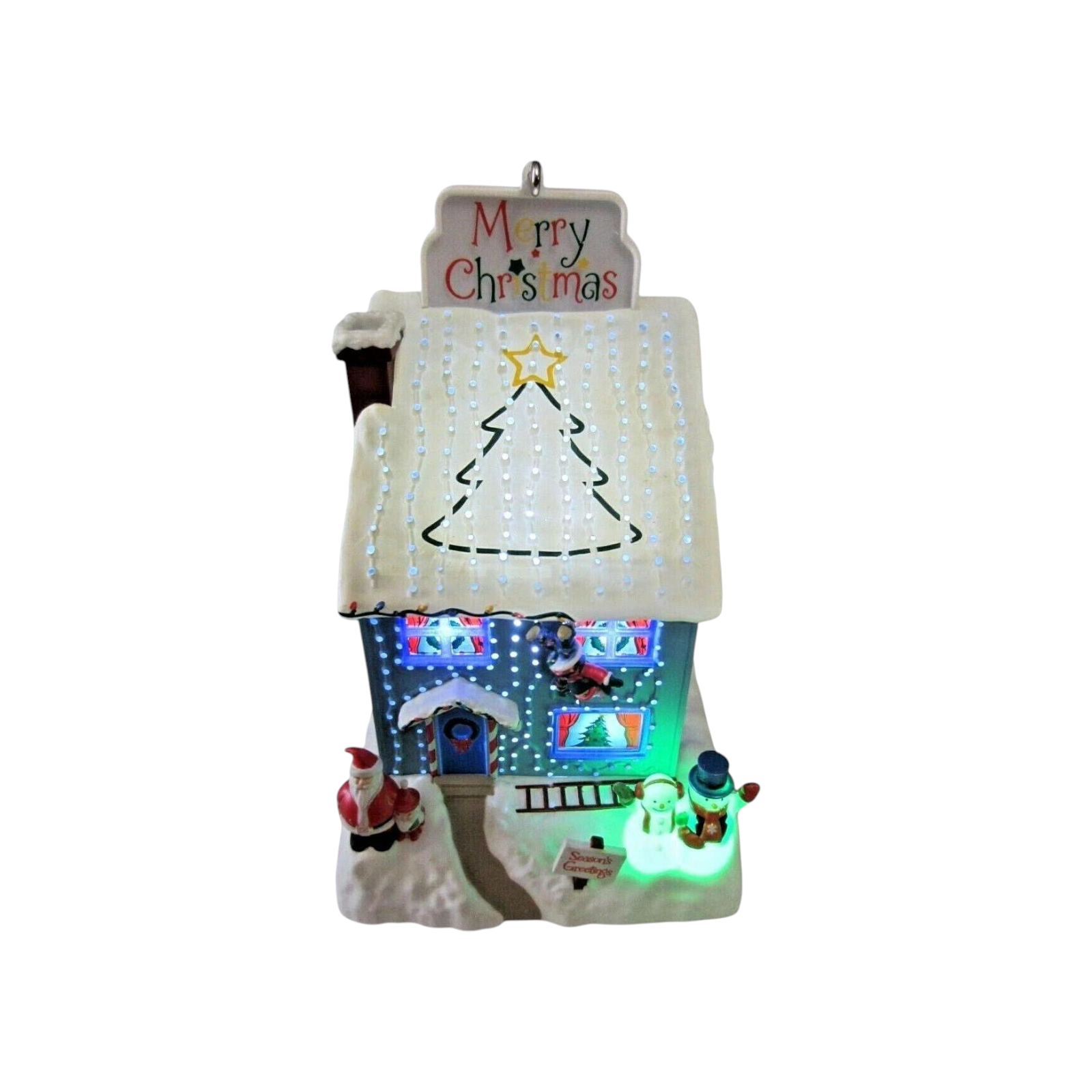Light up your holiday with 2012 Deck the House!, a vibrant Hallmark Keepsake Magic Cord ornament that brings the magic of a festive light show right into your home. This Gold Crown Exclusive piece, designed by Orville Wilson, features a charming house dressed up in full holiday lights. Press the button to activate an interactive light & sound sequence — roofs glow, windows shine, and seasonal music builds to a theatrical crescendo. To fully enjoy the show, it requires Hallmark’s Magic Cord (sold separately) which powers continuous light and keeps the ornament in sync with others on the same cord. Measures approximately 3″ × 4.5″ × 2.5″. Includes the ornament itself; box included when available.