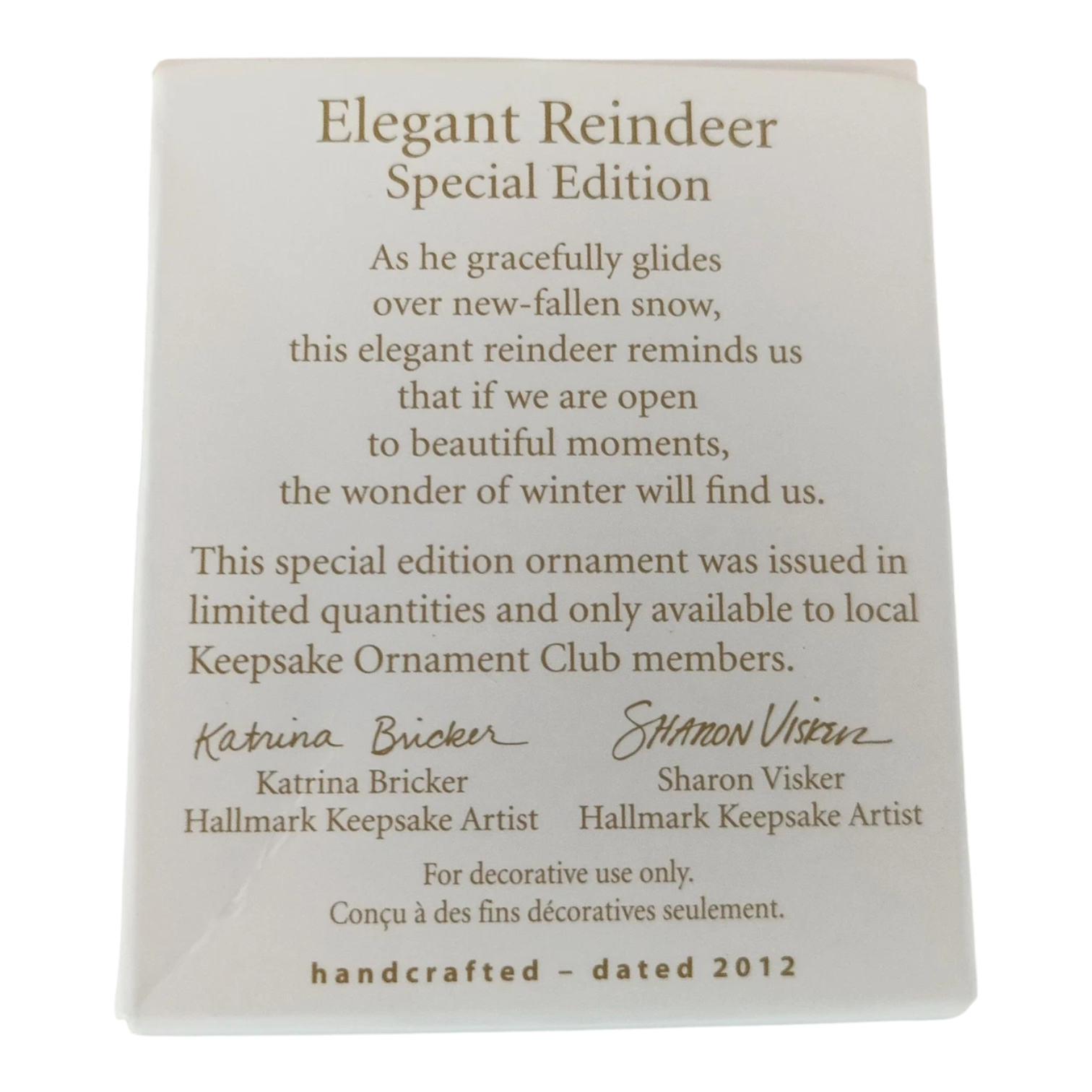 This miniature keepsake ornament features a graceful reindeer in mid-leap, rendered in white with gold accents and subtle glitter details, evoking the elegance of a winter’s glide over new-fallen snow. Released in 2012 exclusively to local Keepsake Ornament Club members, it reflects both holiday charm and collector appeal due to its limited run. Designed by artists Katrina Bricker & Sharon Visker, this 1″ H ornament offers a delicate and refined accent suitable for smaller branches or display collection cases. Its understated elegance makes it ideal for collectors of reindeer motifs or those seeking a subtle, premium addition to their 2012 holiday décor.