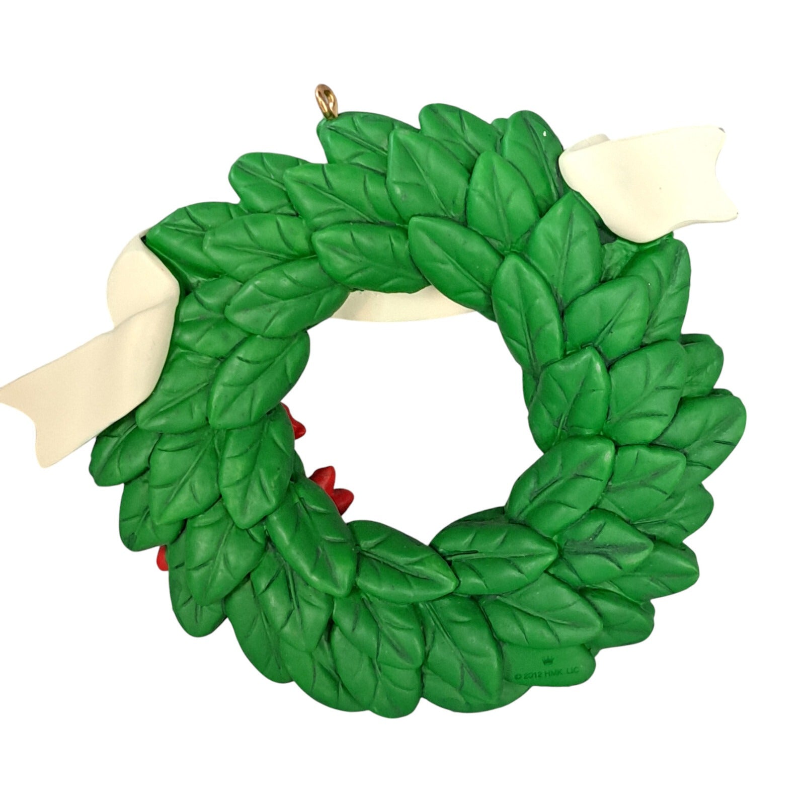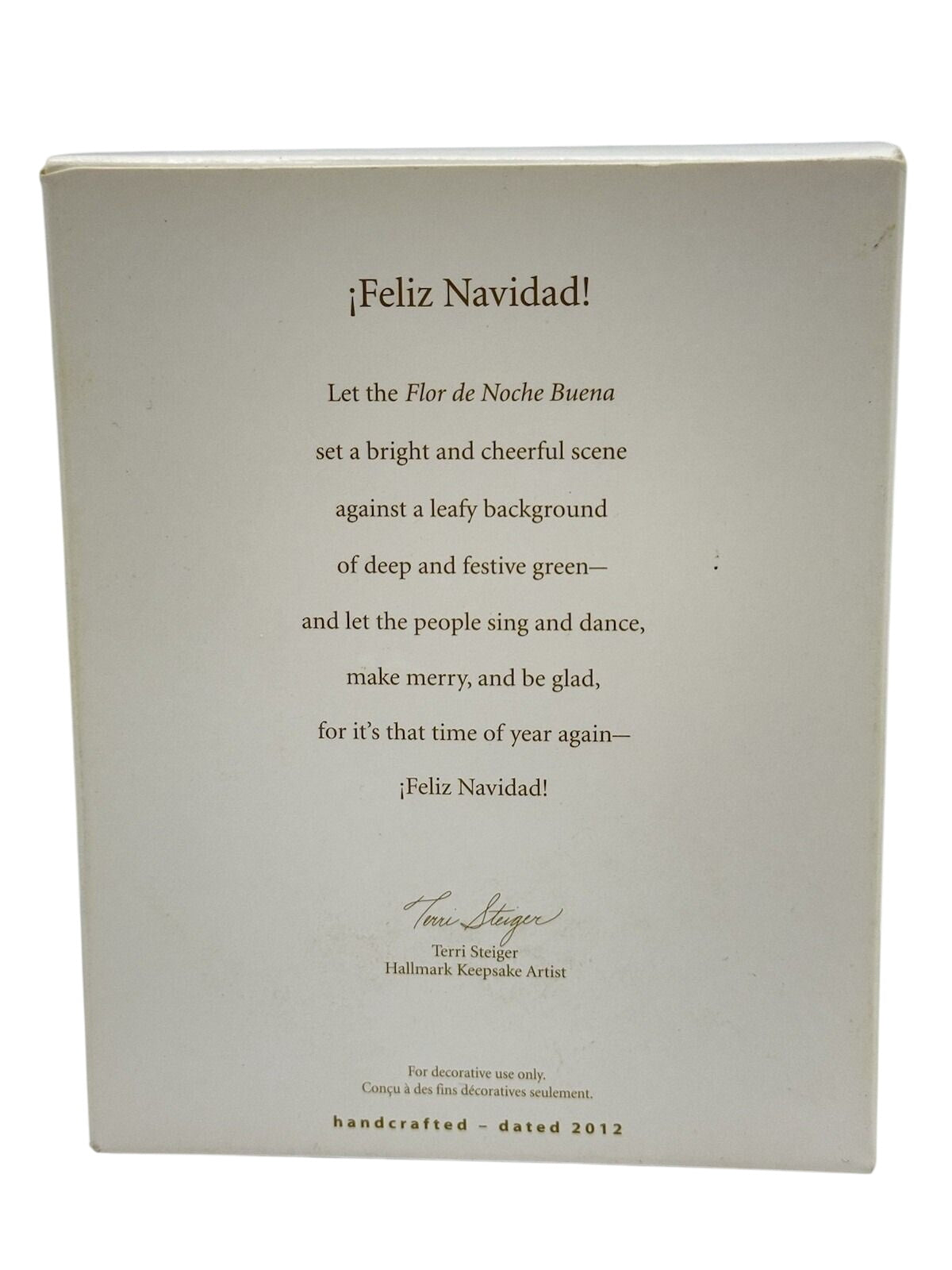 Add a festive Spanish greeting to your holiday décor with Feliz Navidad!, a 2012 Hallmark Keepsake ornament featuring a beautiful wreath design. The ornament showcases a green wreath adorned with poinsettias, ribbon, and a banner at the top that reads “Feliz Navidad!”. Crafted by Terri Steiger, this wreath is the perfect accent for those who love bilingual holiday messages or Hispanic Christmas traditions. The package includes the ornament itself; original box & tag included when available.